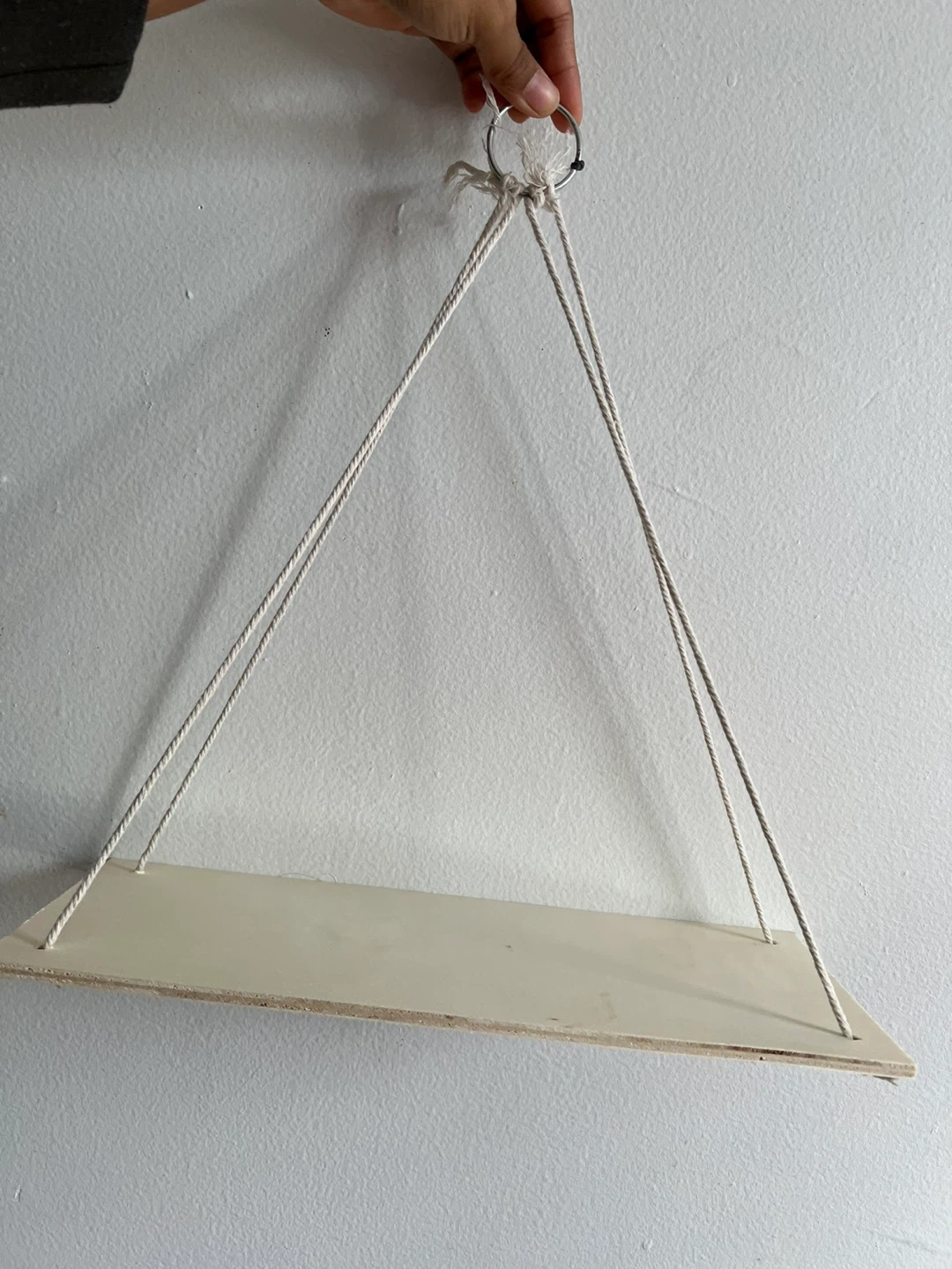 Here's a cute hanging shelf! It's perfect for adding a touch of minimalist style to any room. The shelf is made of a light-colored wood and hangs from a sturdy rope. It's in great condition and ready to be hung up and enjoyed!