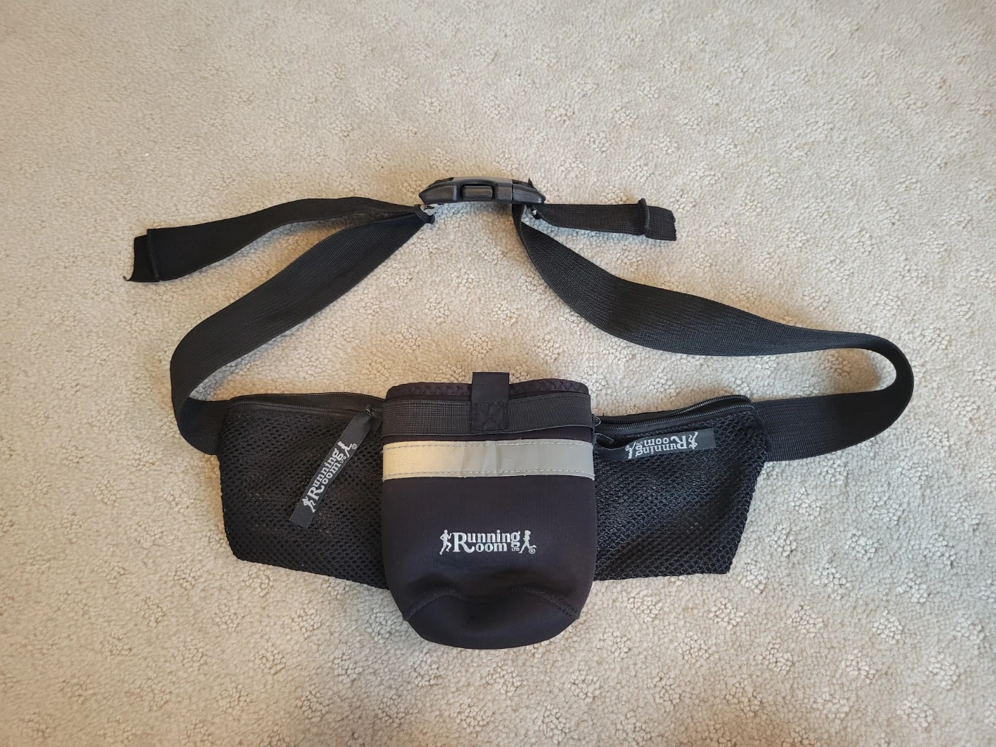 Selling a hydration belt from Running Room. It's in great condition and perfect for your runs! It features a pouch for a water bottle and zippered pockets for your essentials.