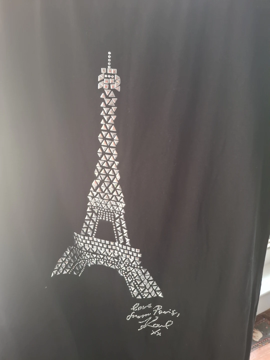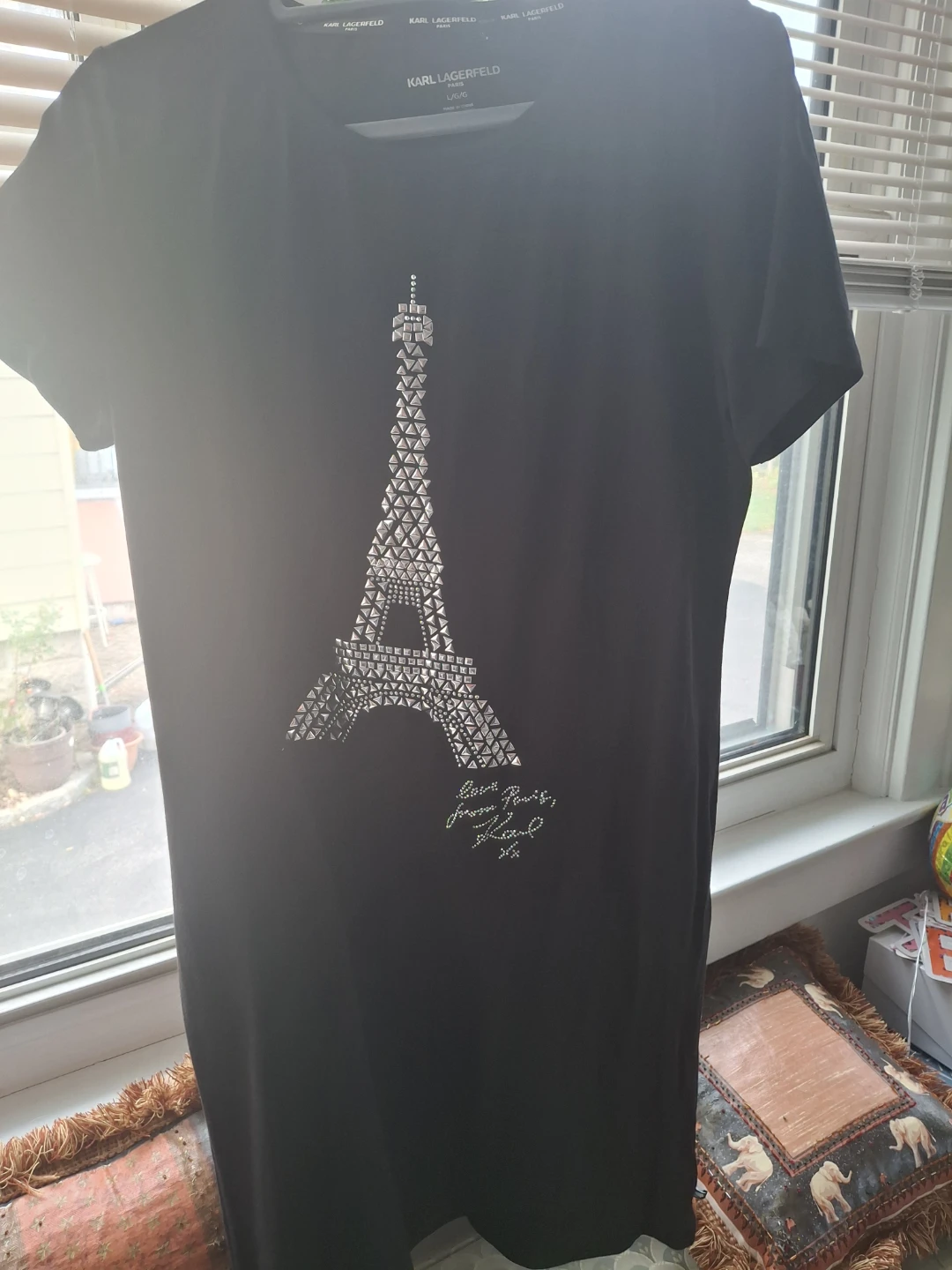 Selling a Karl Lagerfeld Paris black t-shirt! This shirt is a size large and features a stylish Eiffel Tower design in silver. It's made in China and in great condition!