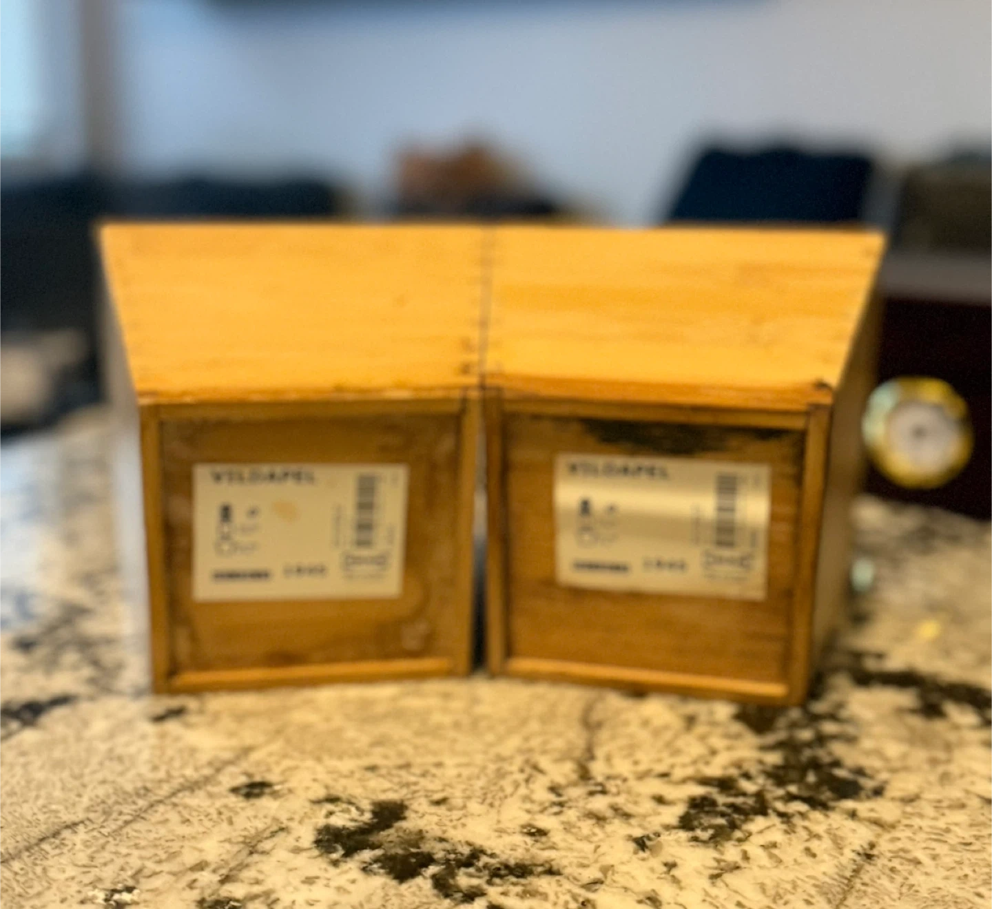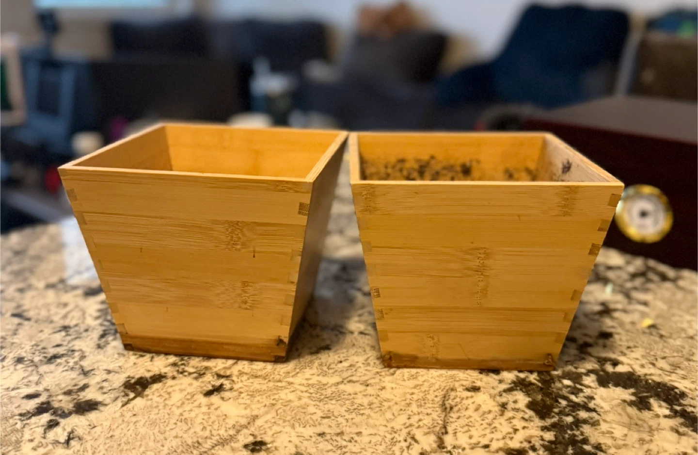 Set of two square bamboo planters from IKEA’s VILDAPEL line. Both have been used and show visible soil and water marks inside, but they’re still sturdy and great for repotting, herbs, or DIY projects.