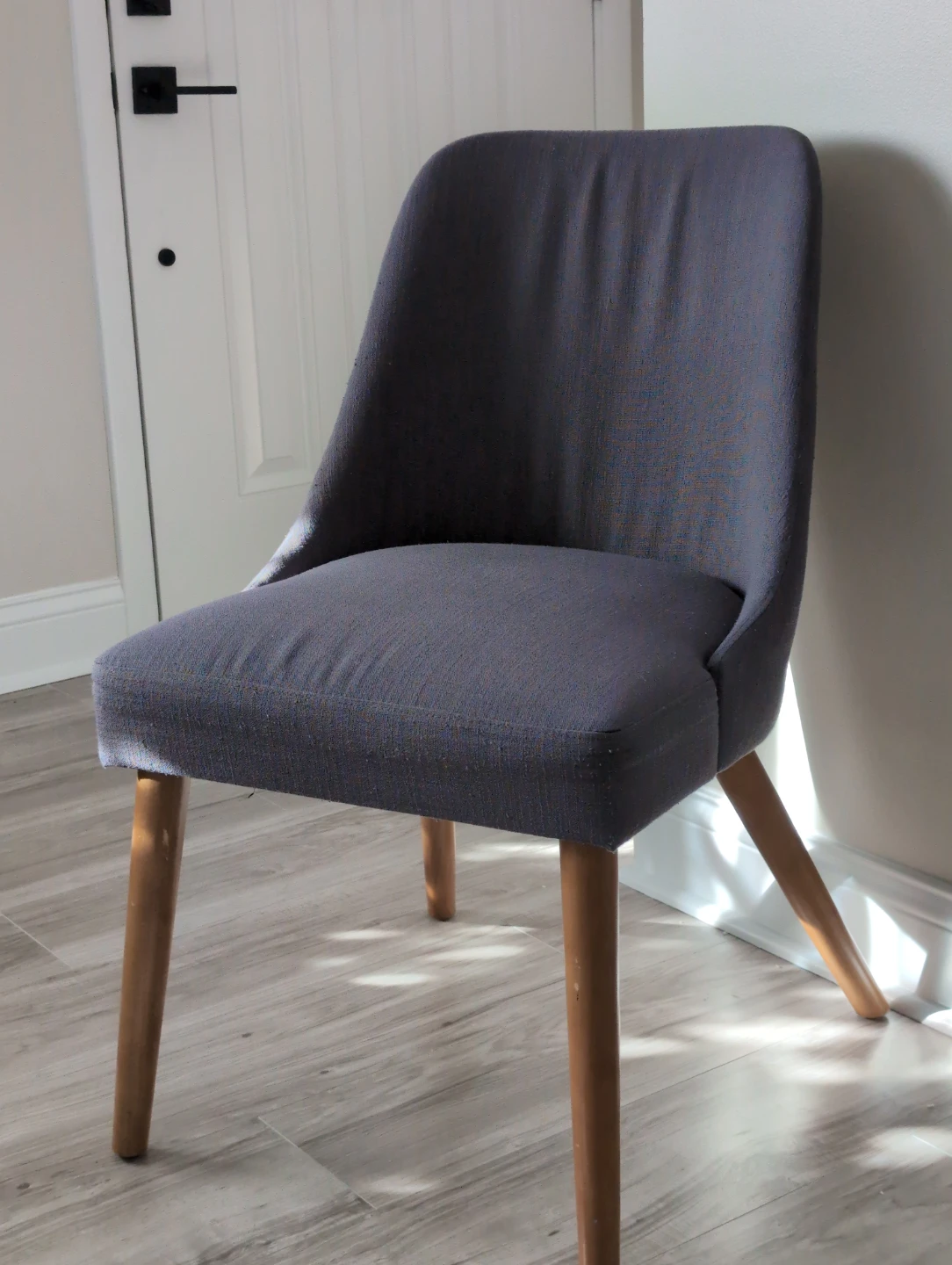 Here's a stylish upholstered dining chair. It features a sleek design with a comfortable seat and backrest, perfect for adding a touch of elegance to your dining area or any room in your home. The chair has wooden legs and a gray fabric upholstery.