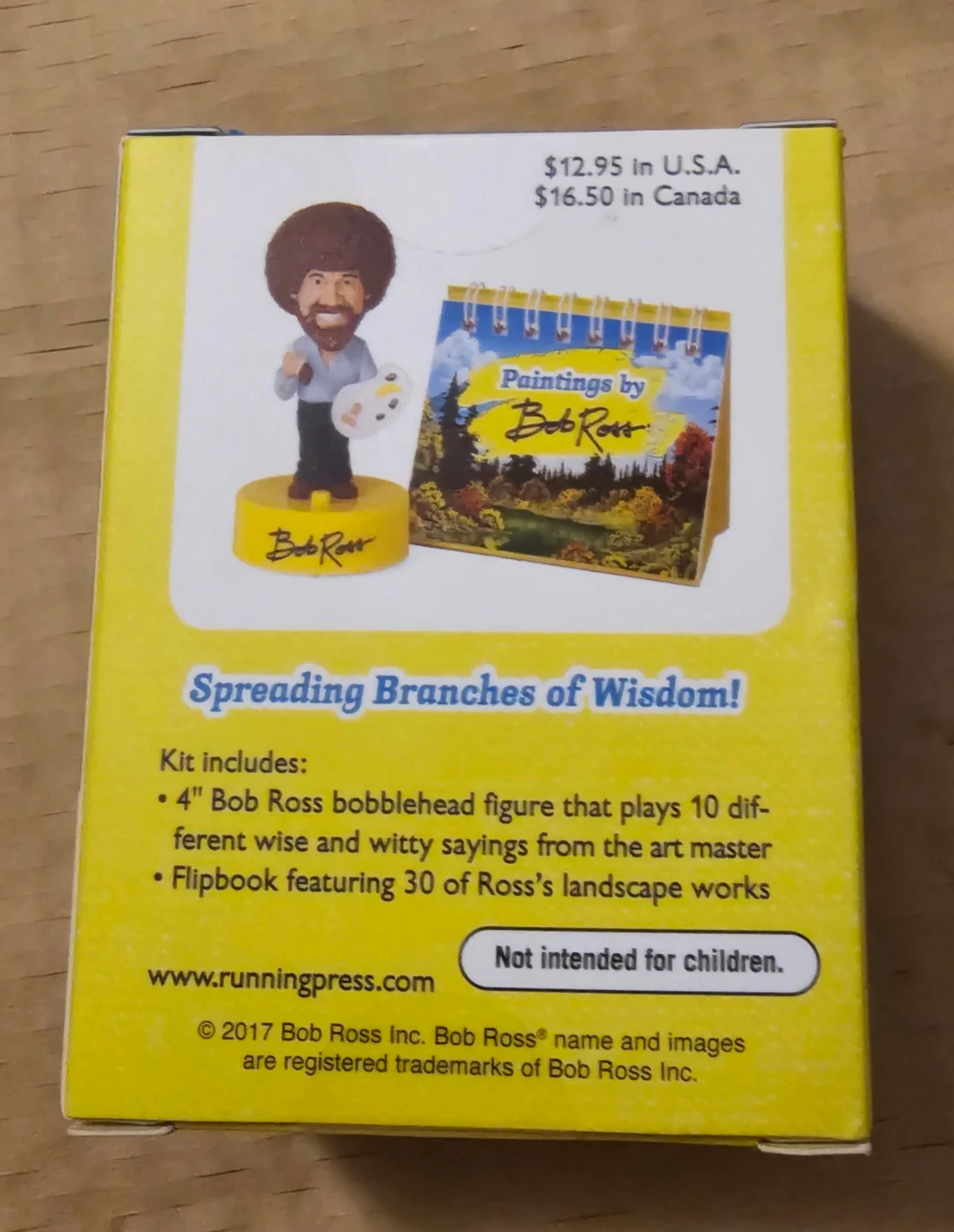 Selling a brand new Bob Ross Bobblehead! This fun figure comes with sound and is still in its original packaging. The kit includes a 4" Bob Ross bobblehead from the art master, plus a flipbook featuring 30 of Ross's landscape works.