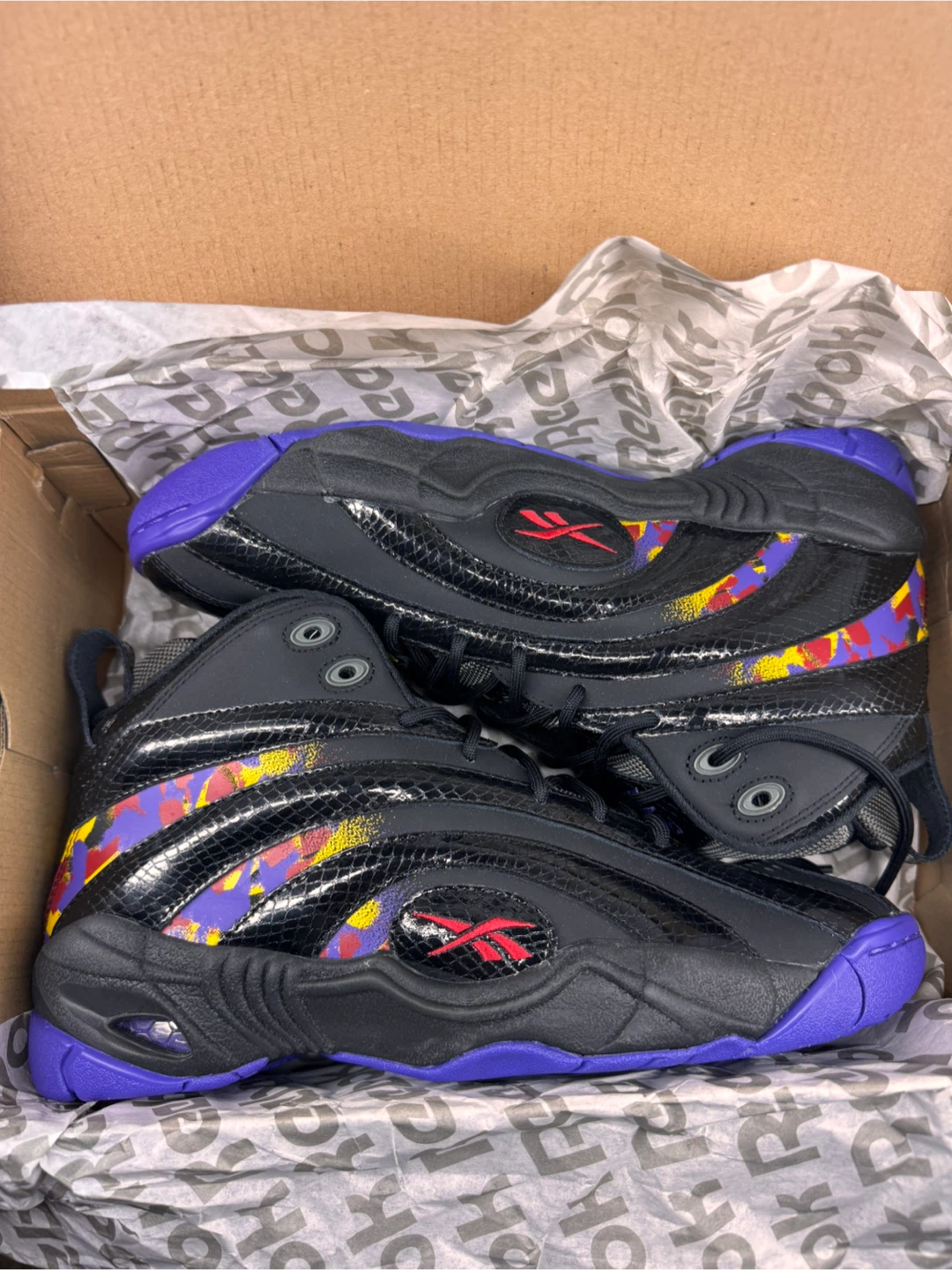 Selling a pair of Reebok Shaqnosis shoes in black and purple. They come with the original box. These shoes have a unique design and are in great condition. Perfect for fans of Shaq or anyone looking for a stylish pair of sneakers!
