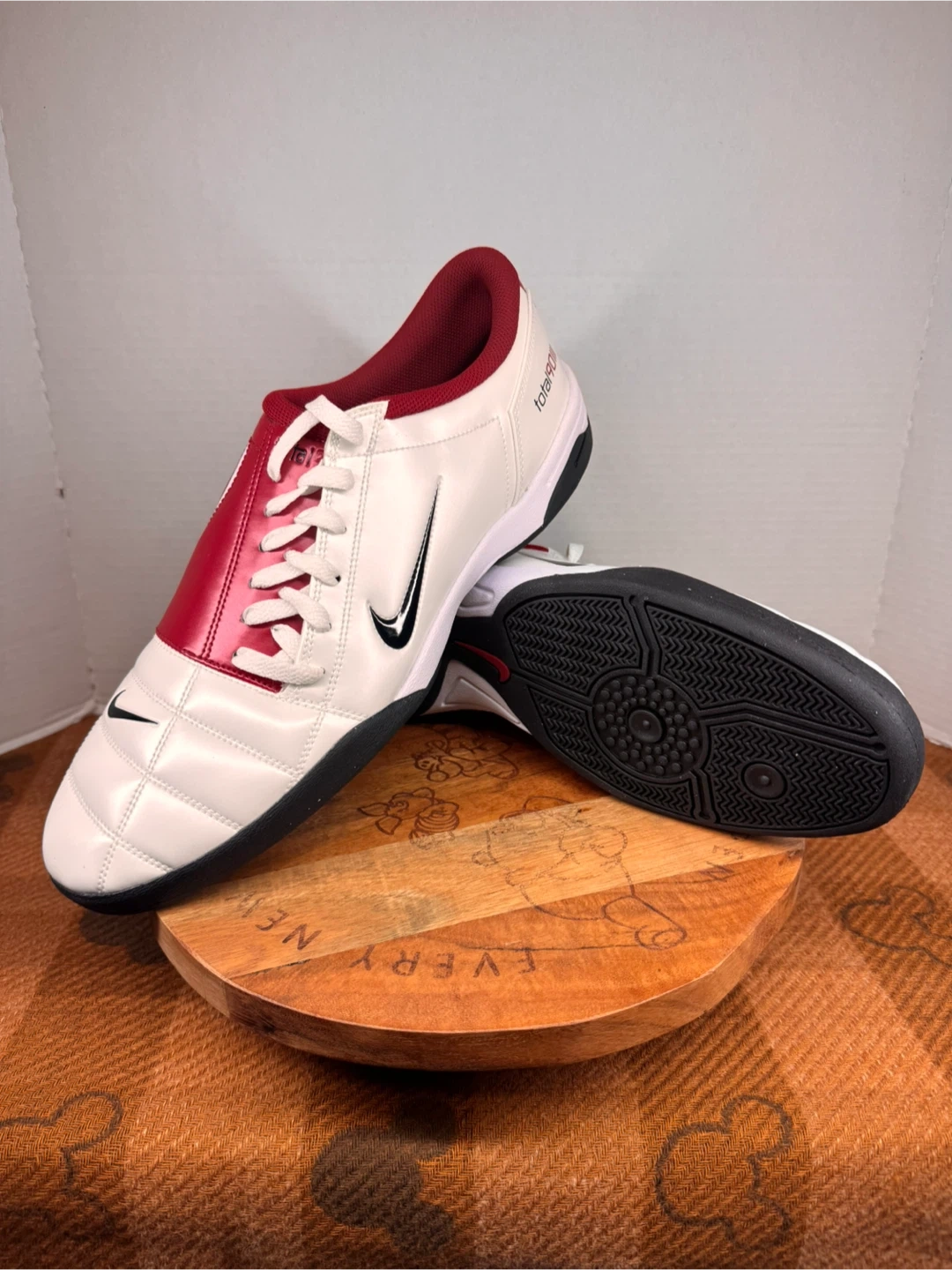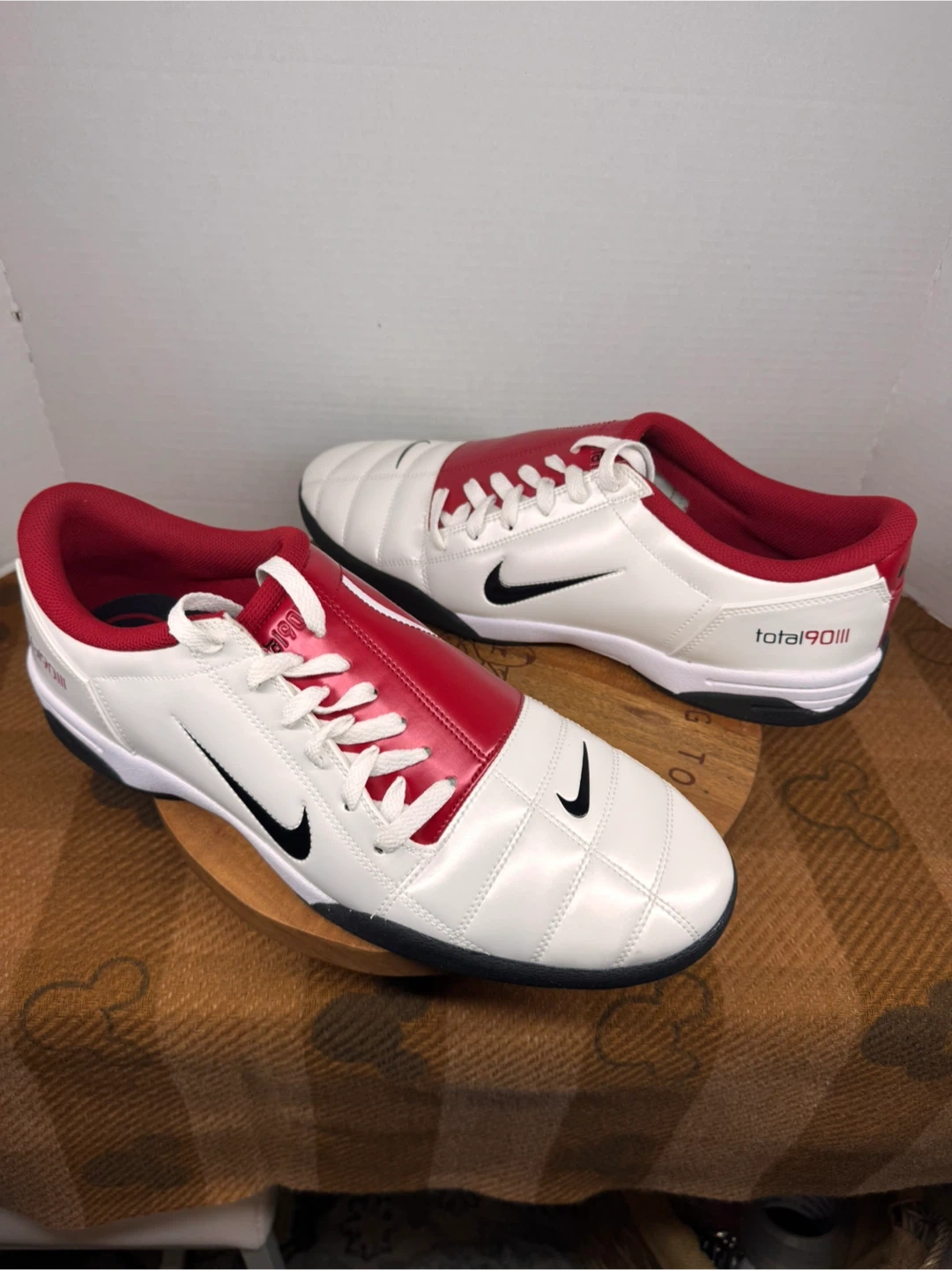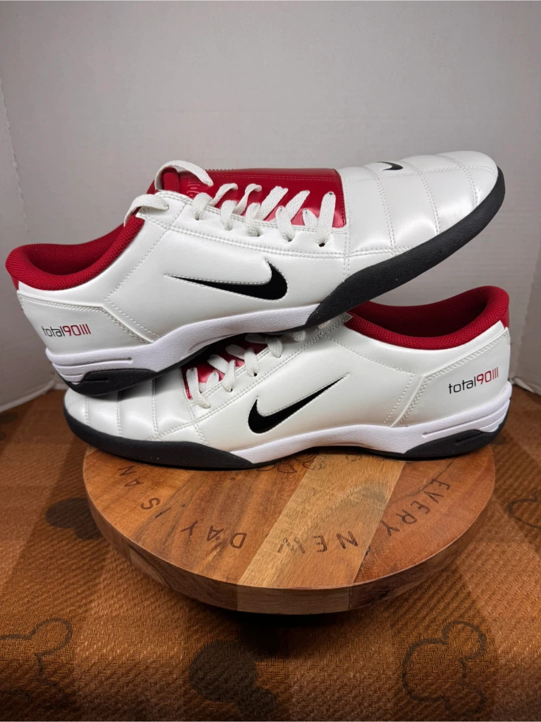 Selling a pair of Nike Total 90 III indoor soccer shoes. They feature a classic design with a white and red colorway and the iconic Nike swoosh. Great for indoor soccer or futsal!