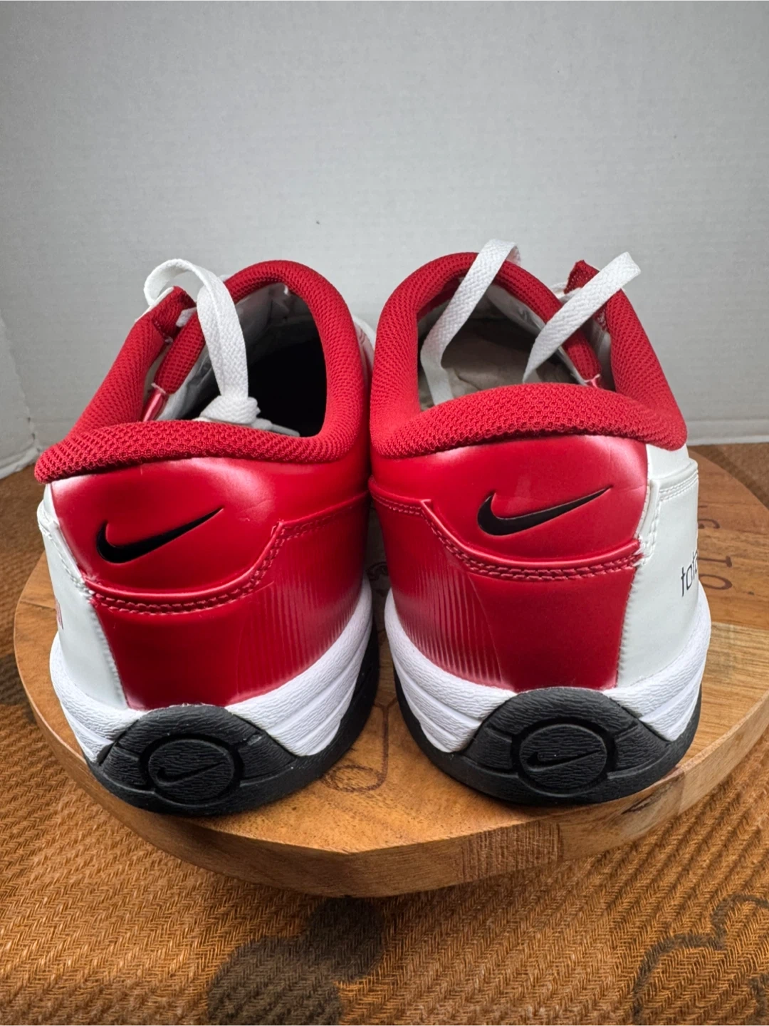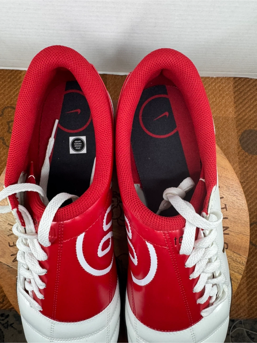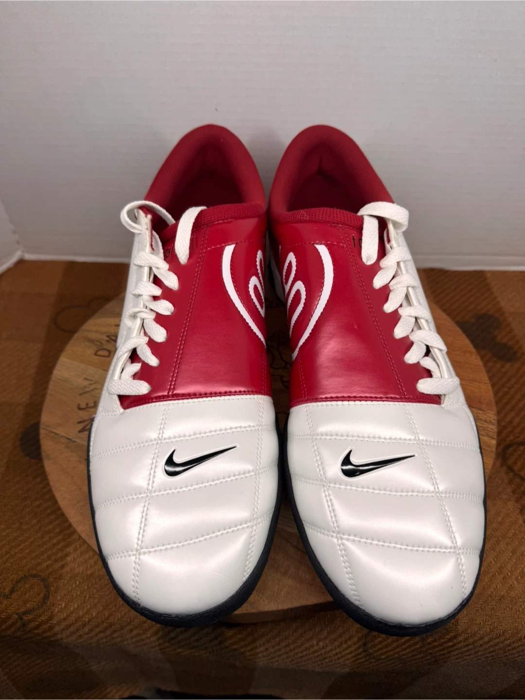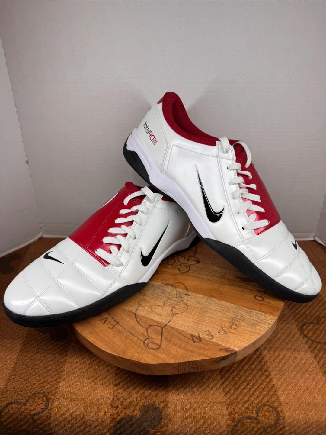 Selling a pair of Nike Total 90 III indoor soccer shoes. They feature a classic design with a white and red colorway and the iconic Nike swoosh. Great for indoor soccer or futsal!