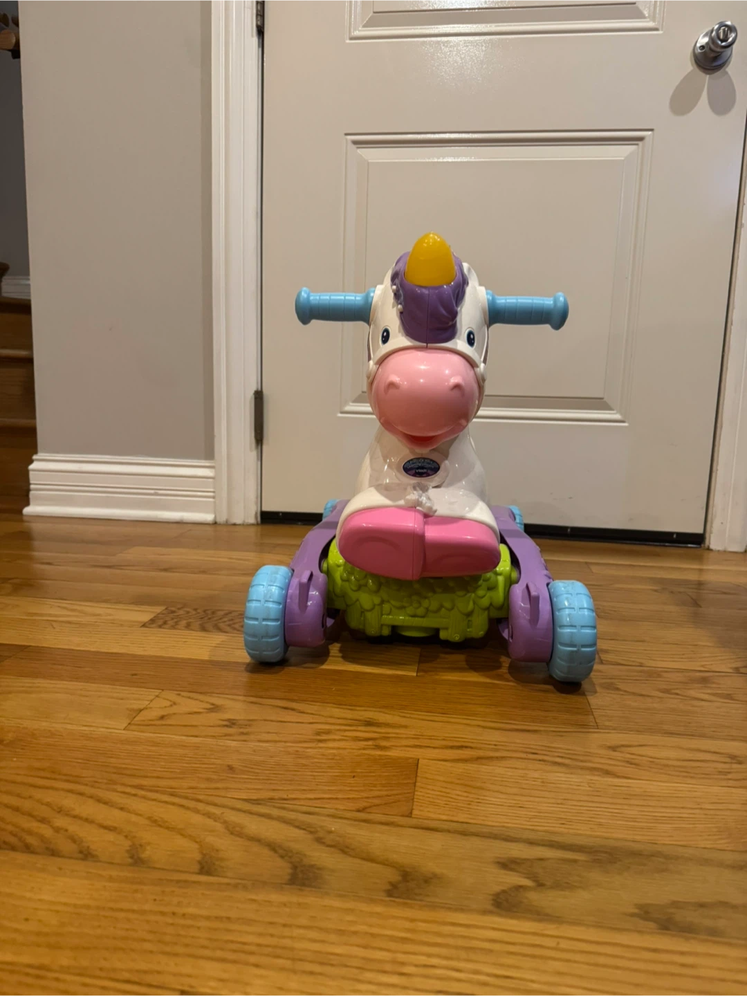 This is a cute unicorn ride-on toy from Fisher-Price! It's in great condition and ready for a new home. Perfect for toddlers learning to balance and move around. It features a comfortable seat and easy-grip handlebars for a safe and fun riding experience