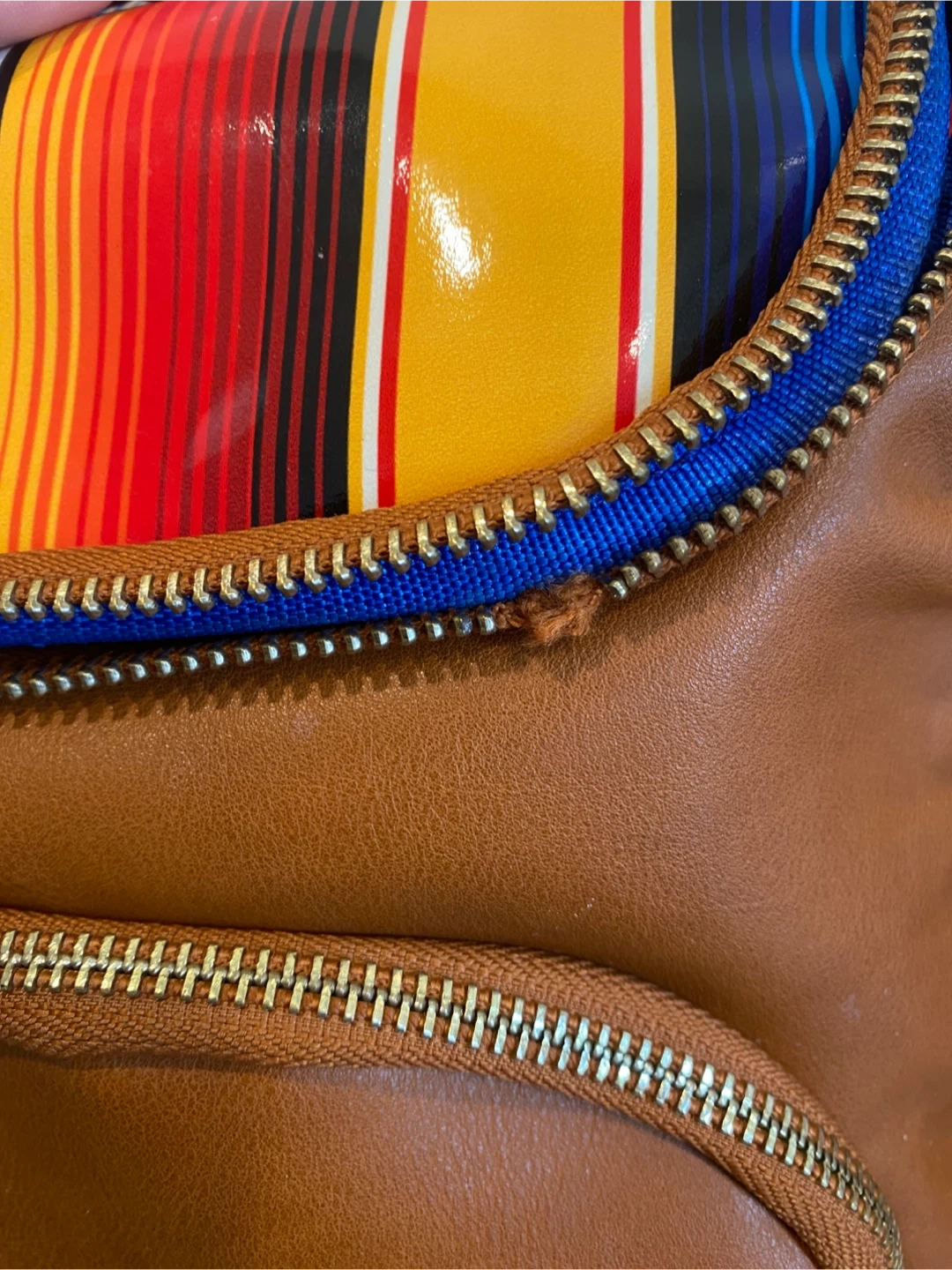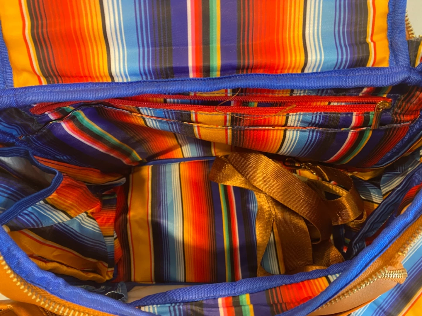 This is a Luli Bebe diaper bag backpack with a serape design. It comes with a bottle holder, a small pouch, and a changing pad. It's in great condition, just needs a fixed zipper and it’ll be ready for the road!