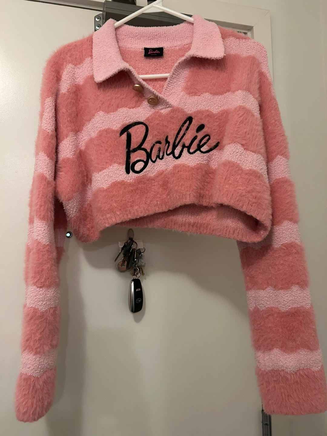 Super cute Barbie sweater! It's a fuzzy knit with pink stripes. Oversized style can fit XS-M. Perfect for adding a pop of fun to your wardrobe!