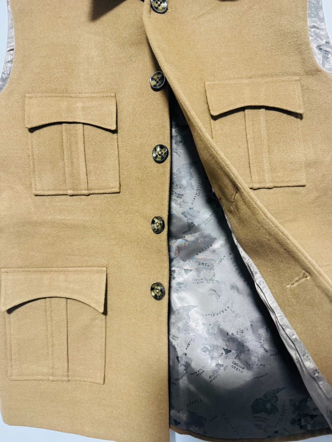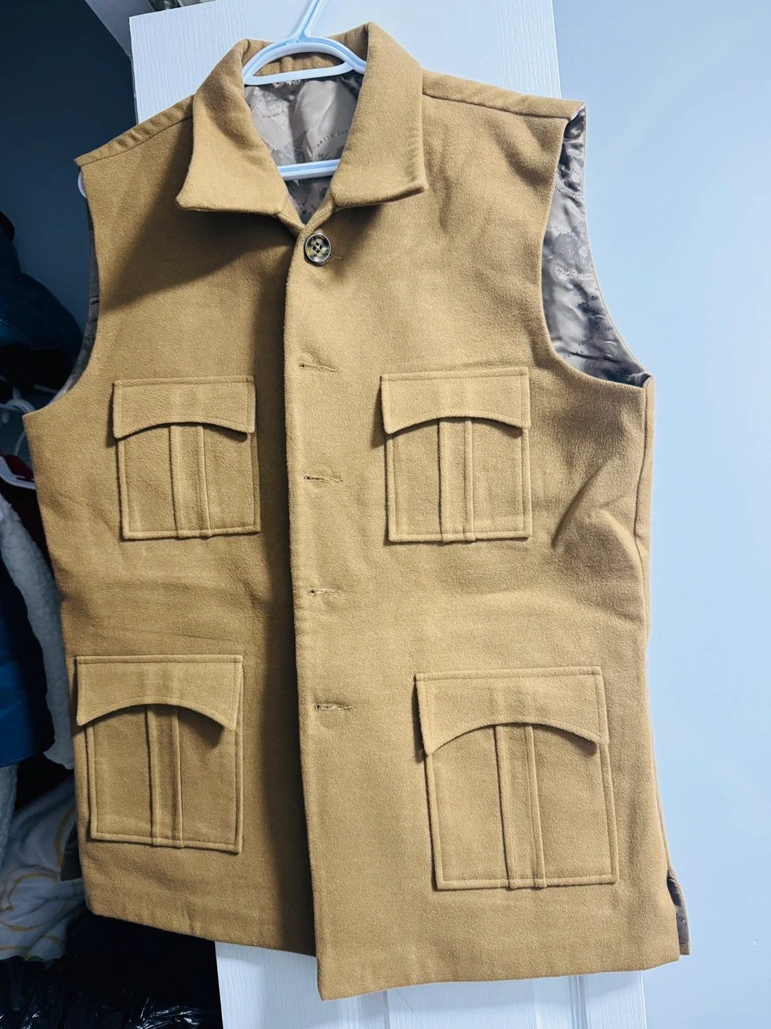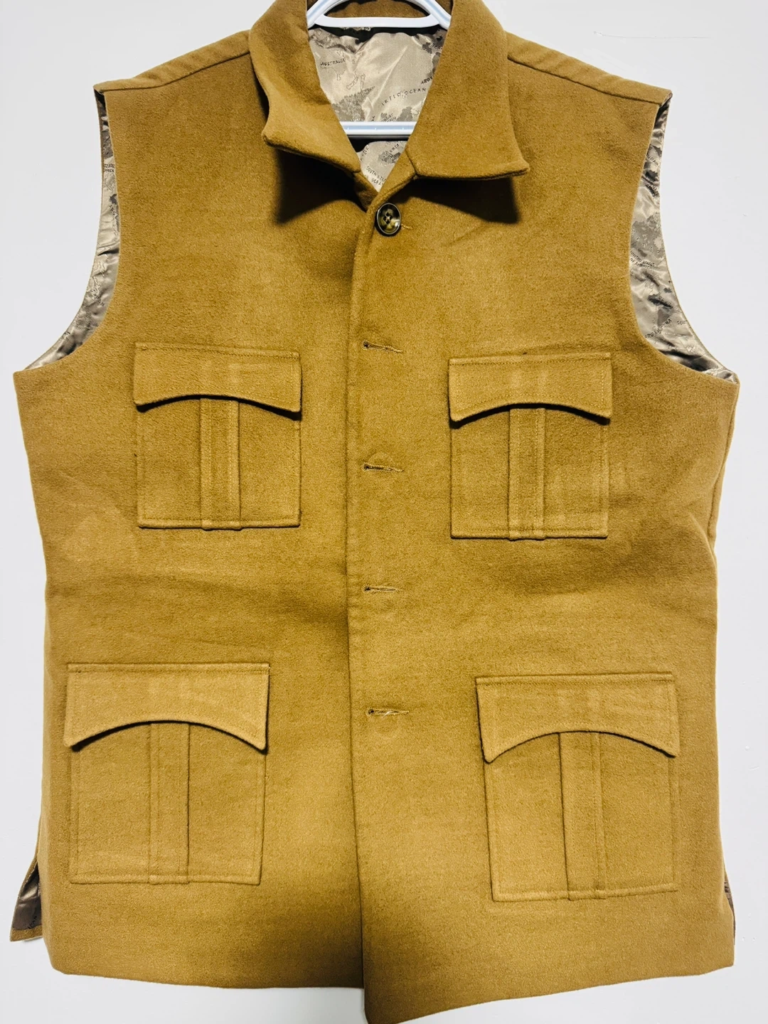 Here's a stylish tan wool vest that could be a great addition to your wardrobe! It features a classic design with functional pockets, perfect for adding a touch of utility and warmth to any outfit