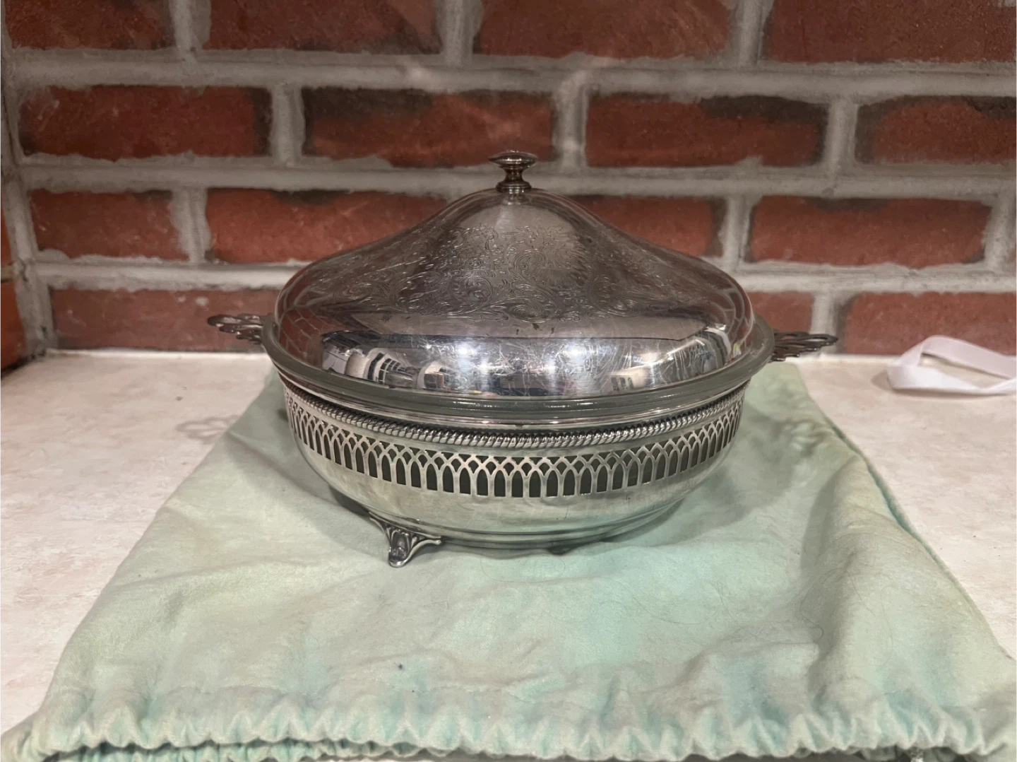 Selling a lovely silver-plated glass bowl with a lid. It's in great condition and would be a beautiful addition to any table setting. Perfect for serving dishes or displaying decorative items!