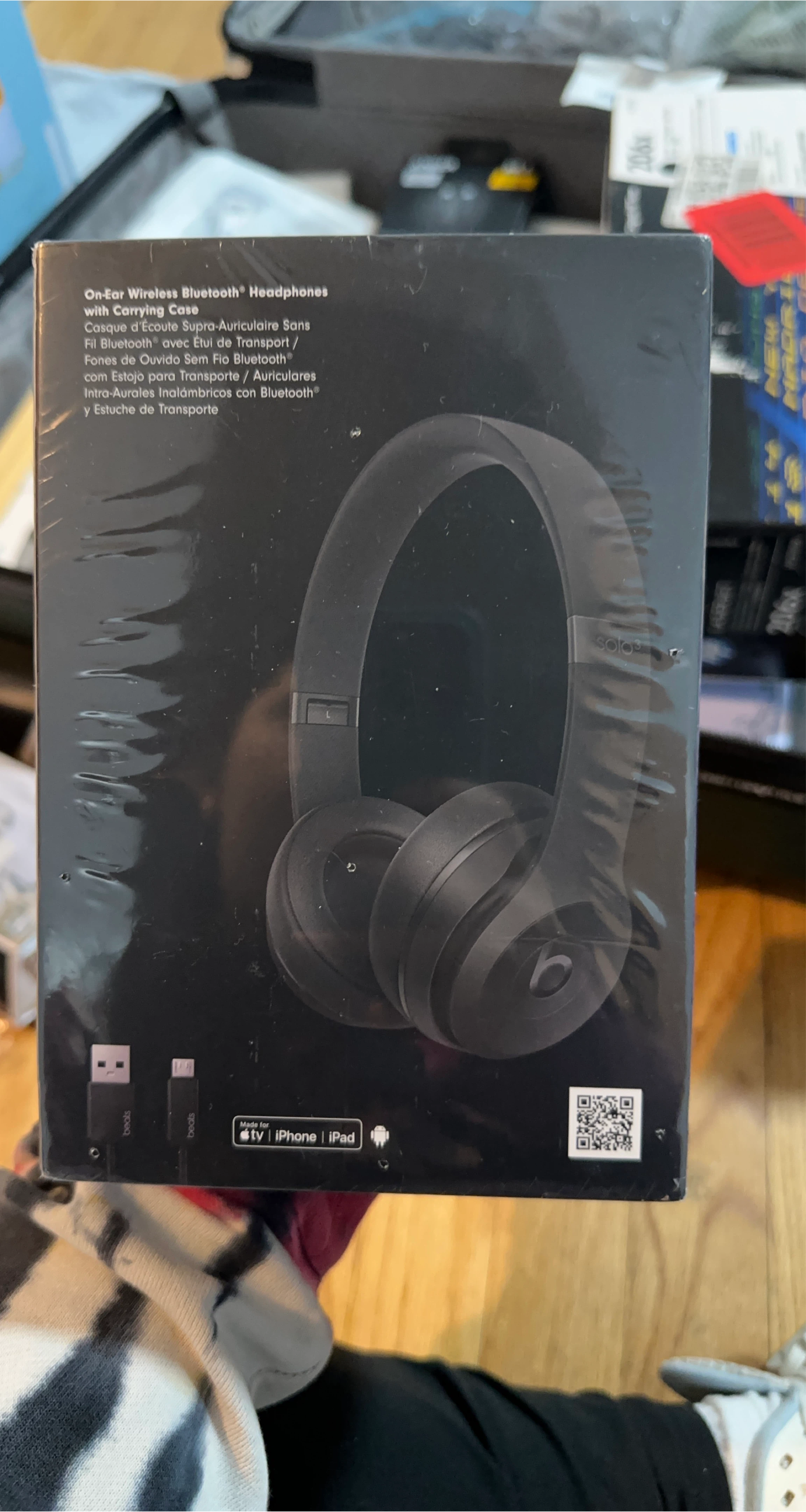 Selling a pair of Beats Solo on-ear wireless Bluetooth headphones. These come with a carrying case and are compatible with Apple devices. Includes Beats USB cable