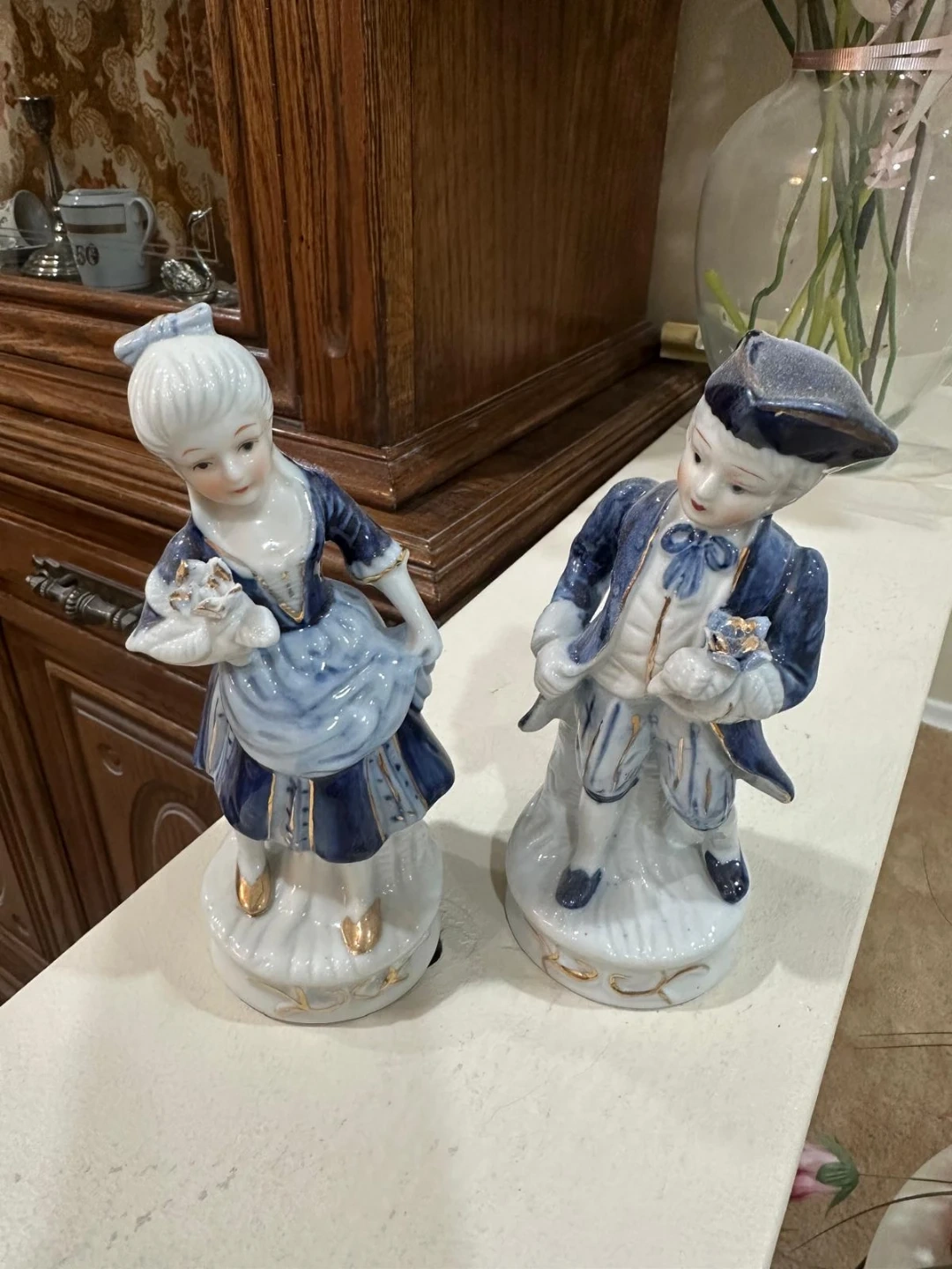 Selling a pair of vintage porcelain figurines. They feature a boy and a girl in blue and white outfits. They would make a lovely addition to any collection or home decor!