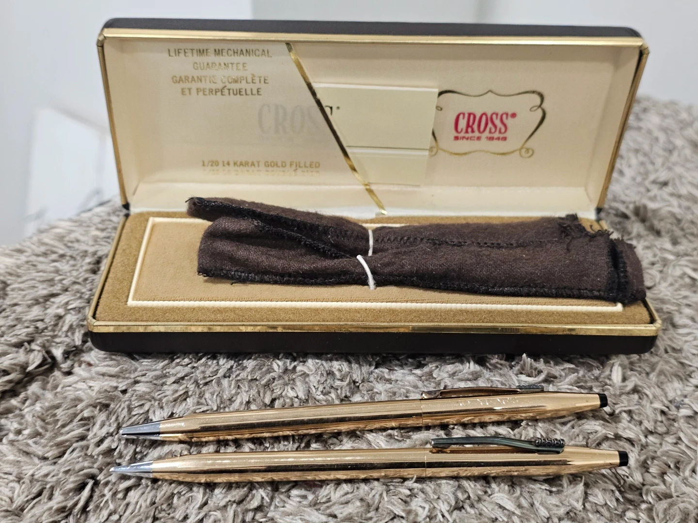 Selling a beautiful Cross pen and pencil set. It's 14 karat gold filled and comes with its original box and cloth. A timeless set for writing or collecting!