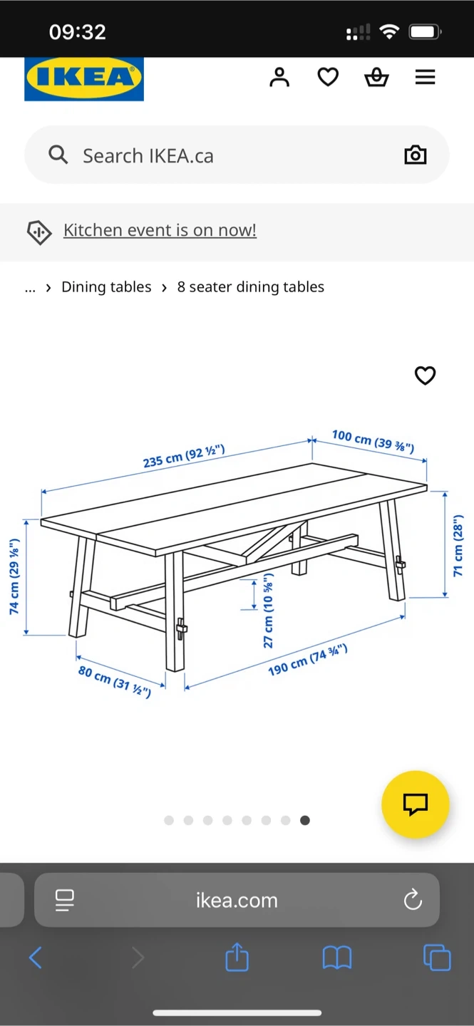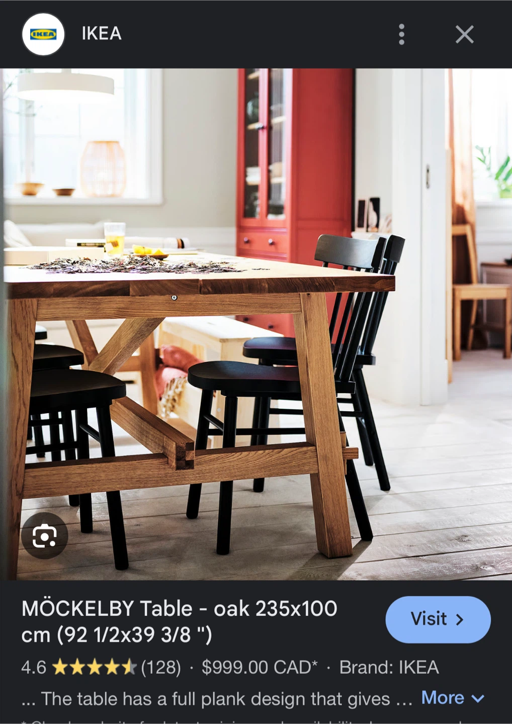 Selling an IKEA MÖCKELBY table in oak. It's a beautiful and sturdy table, perfect for family dinners or gatherings. The dimensions are 235x100 cm (92 1/2x39 3/8 "). Originally bought for $999.00 CAD.
