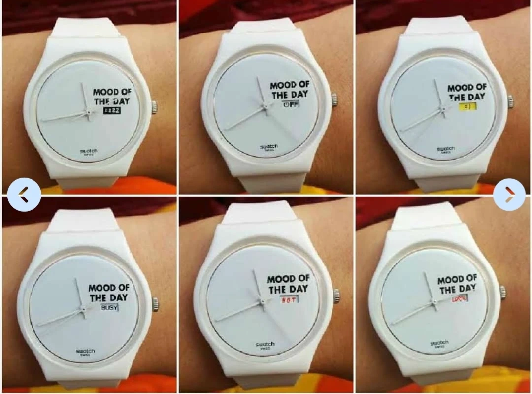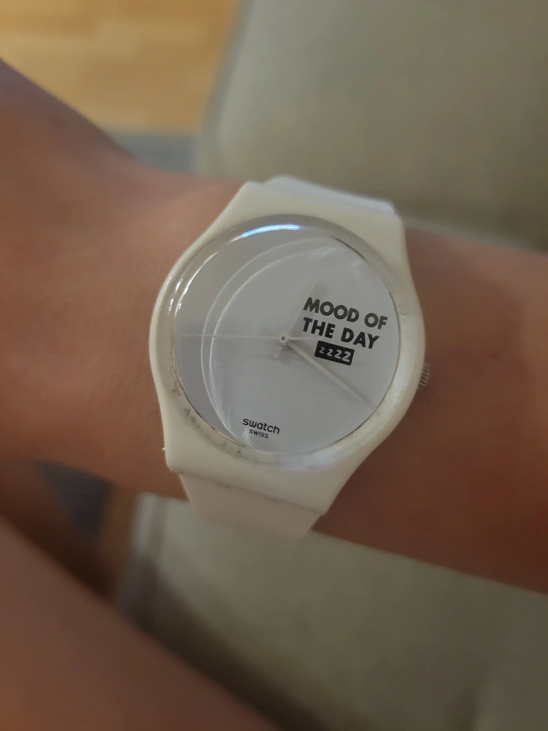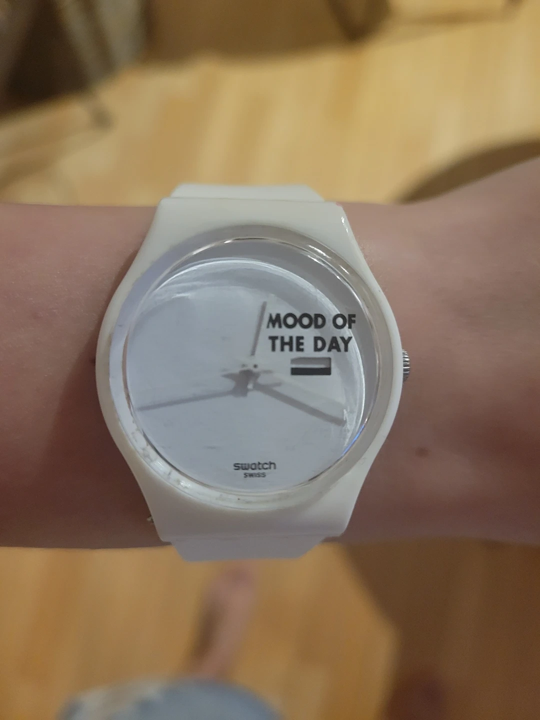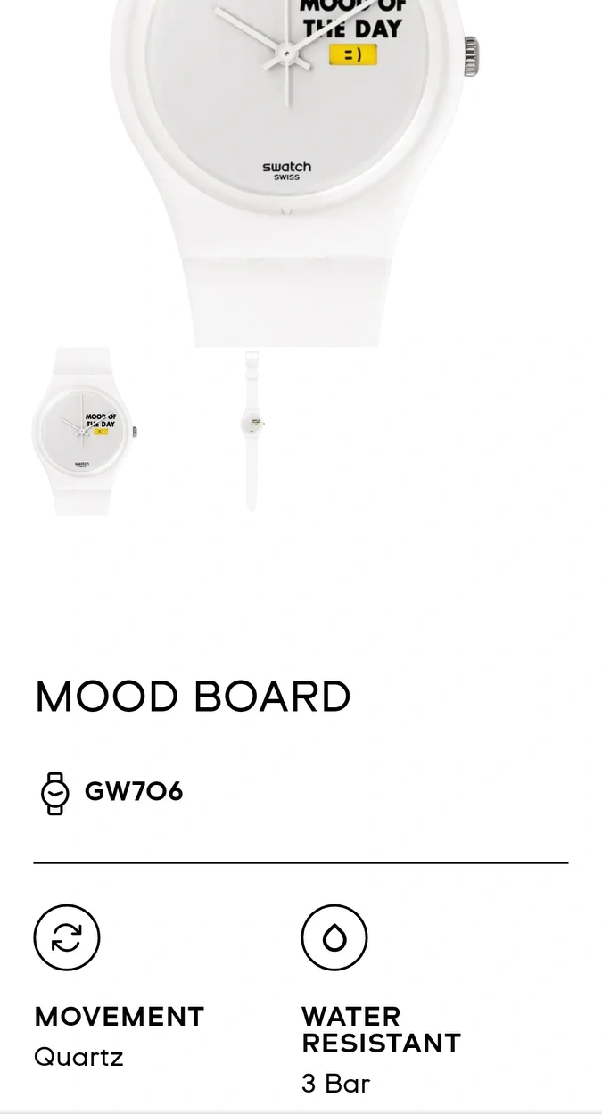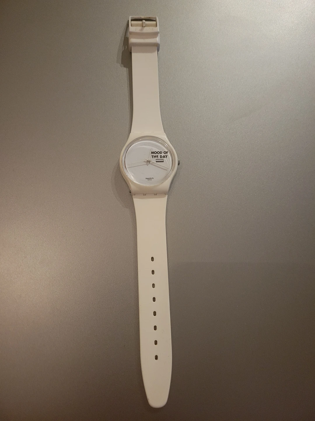 Swatch Mood Board. Water Resistant. The strap is soft silicone, in good condition. It needs a new battery.