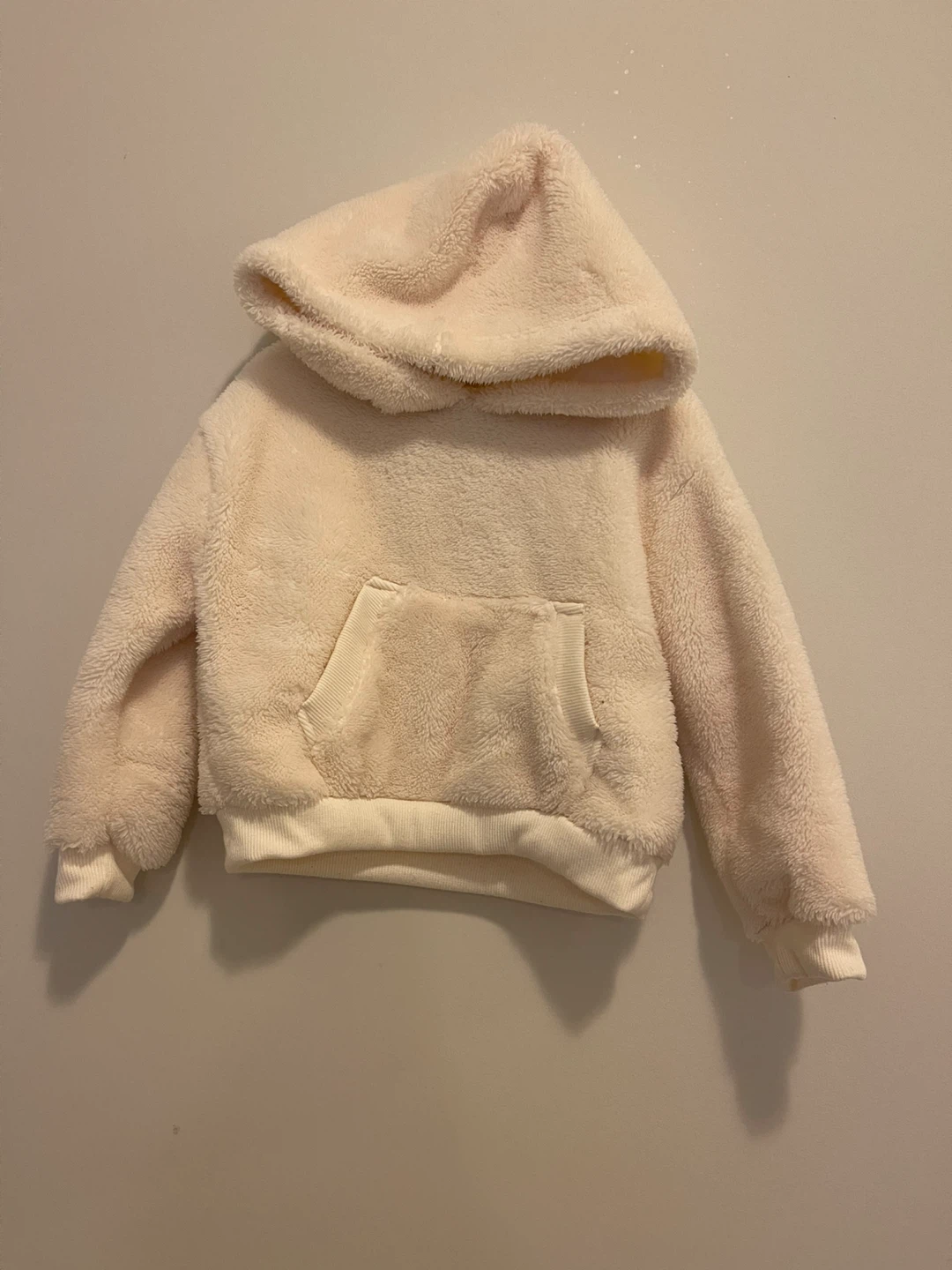 Selling a cozy, fuzzy hoodie for kids! It's a cream-coloured hoodie that's super soft and perfect for keeping your little one warm on cooler days. Has a cute little pocket on the front too!