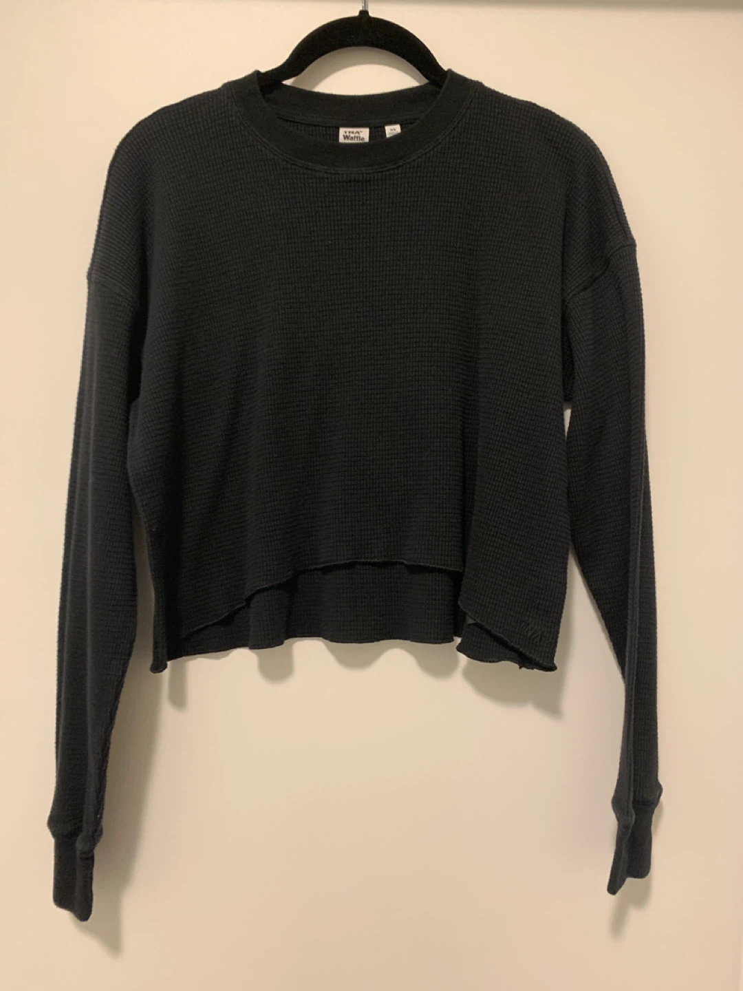 Selling a TNA Waffle long sleeve top in size XS! It's a super comfy waffle knit material, perfect for layering or wearing on its own. The black colour makes it easy to match with anything in your wardrobe. It has a slightly cropped fit and a relaxed style.