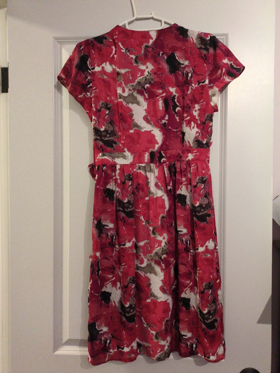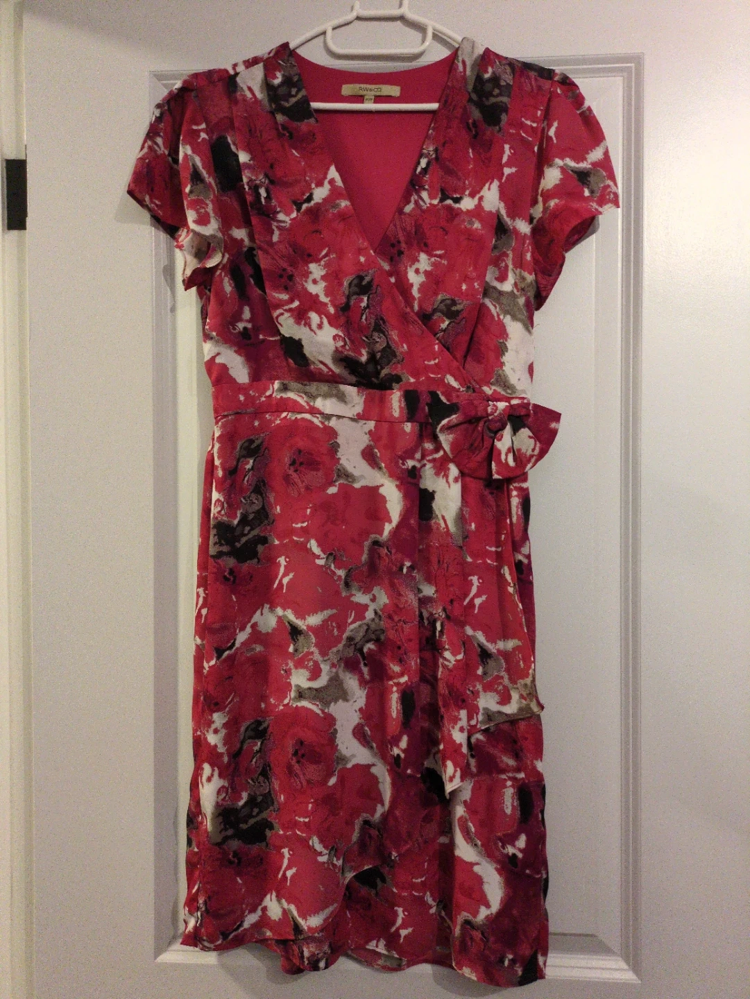 Selling a beautiful RW&co dress in size XS. The dress features a vibrant floral print with red, white, and black colours. Perfect for work or special occasion.