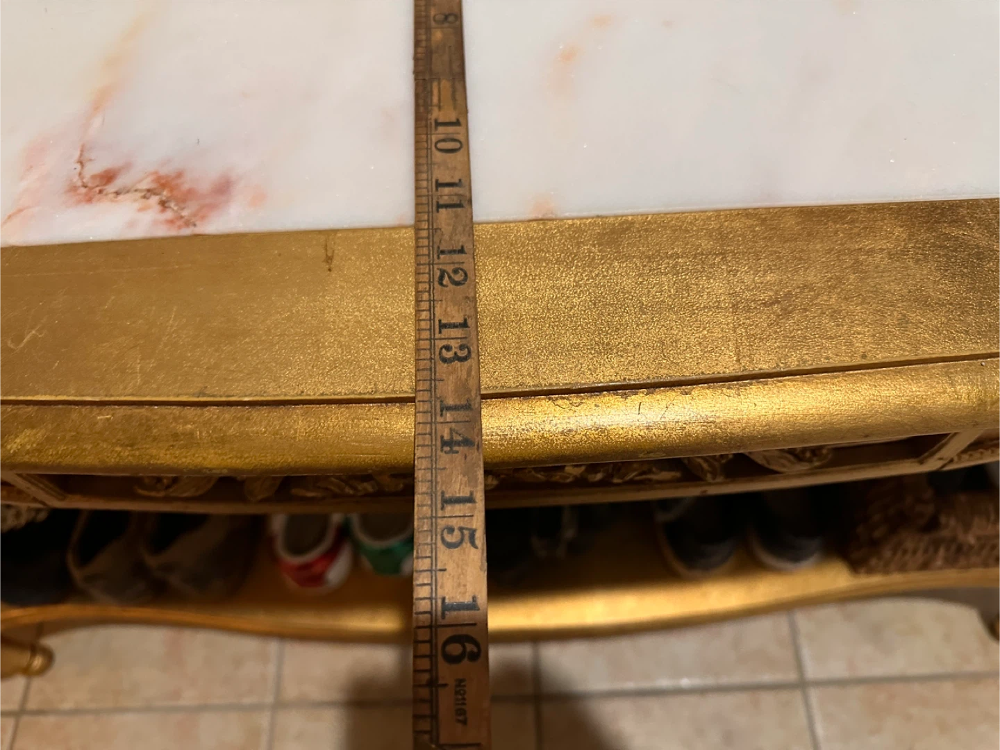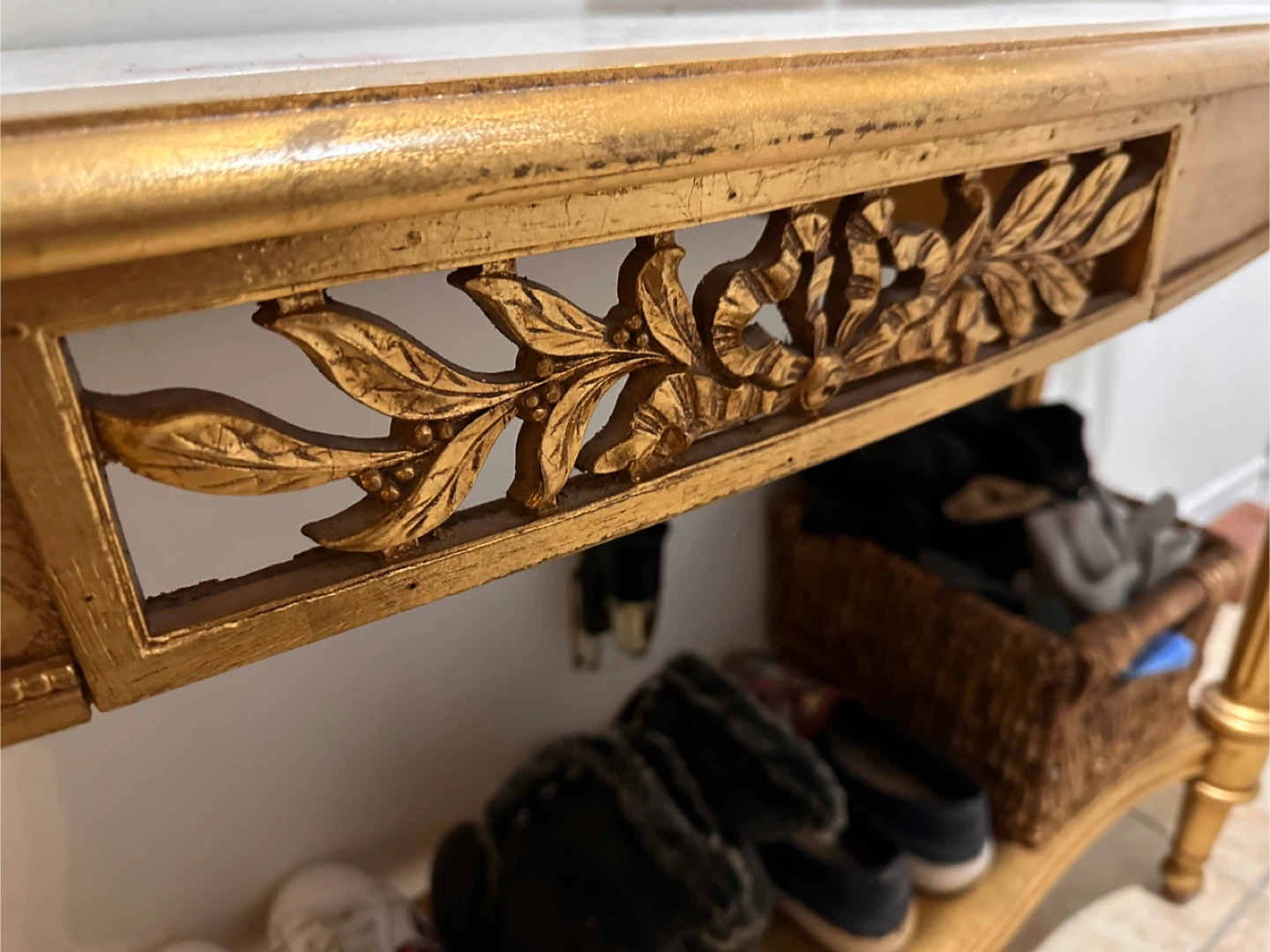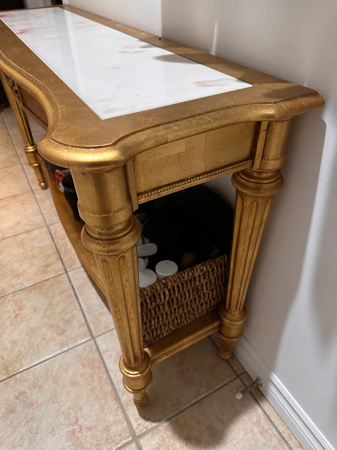 This piece is in very good vintage condition. There are no noted chips or cracks in the marble. The framework has the possibility of having a minor scuff or two to the paint, however, it would be hard to tell with the antiqued finish.