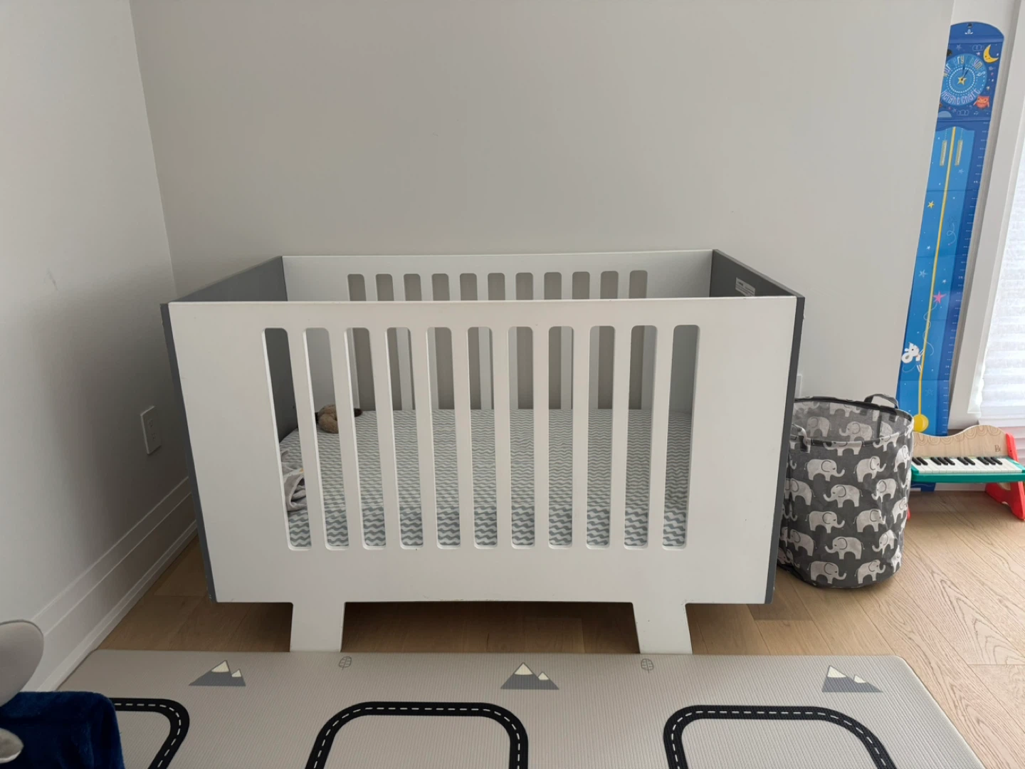 Selling a modern baby crib in great condition! MATTRESS and fitted sheet INCLUDED. The crib features a sleek white and grey design that would look great in any nursery. Perfect for your little one's sleep and comfort