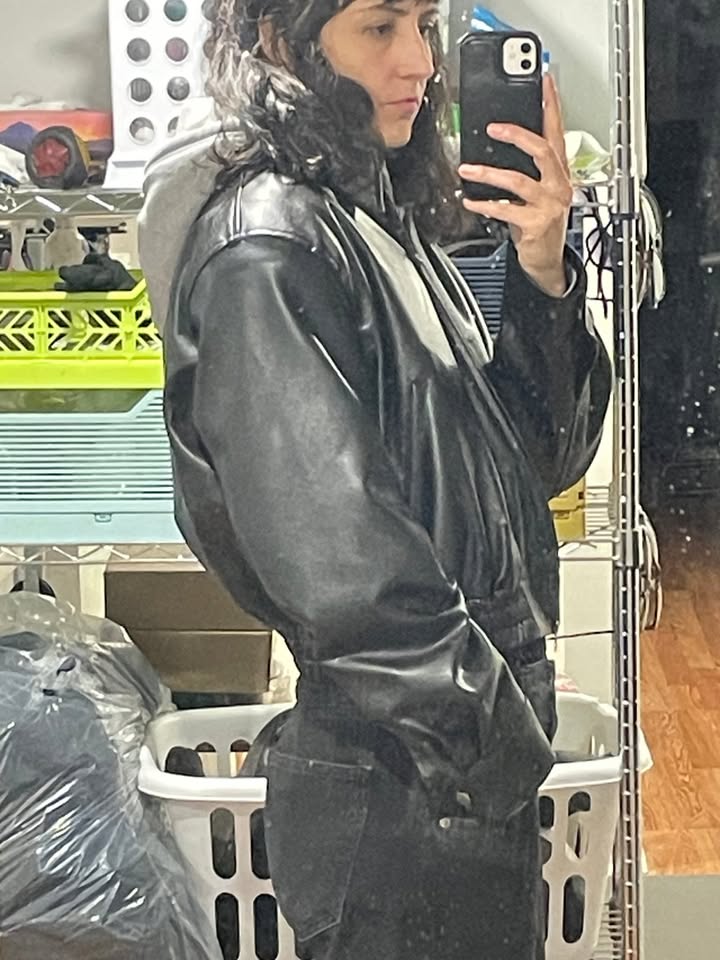 Was $300 new- only worn a couple times, in perfect condition. I do find the zipper slightly sticky at the bottom although it was like that when i bought it. Has shoulder pads.