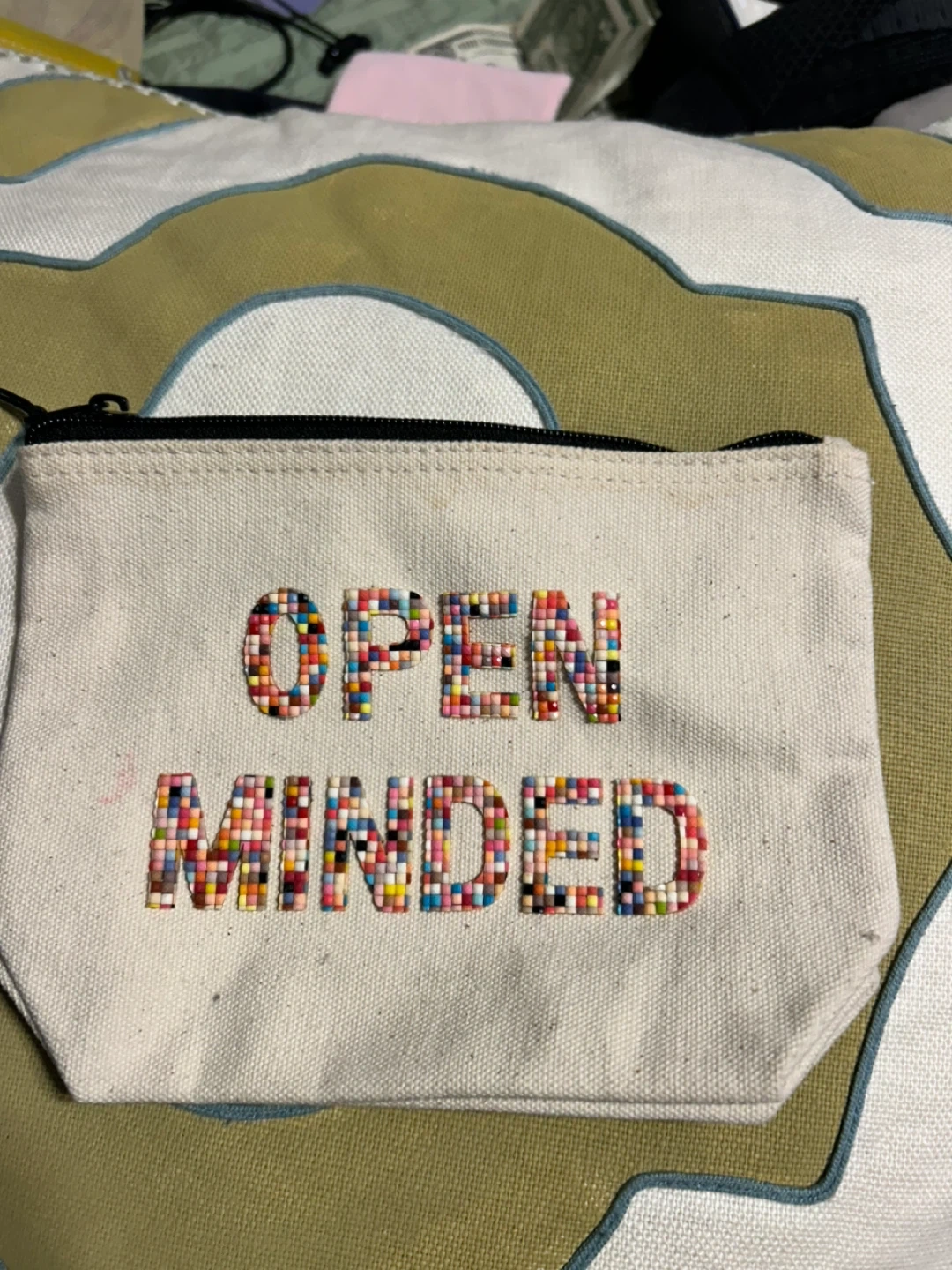 Cute little pouch with 'Open Minded' spelled out in colorful beads on one side and the US Open logo on the other. Perfect for carrying small items!