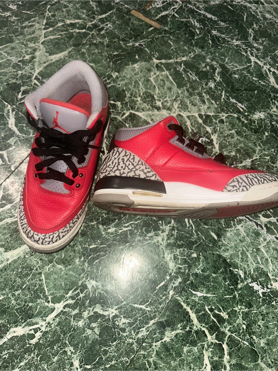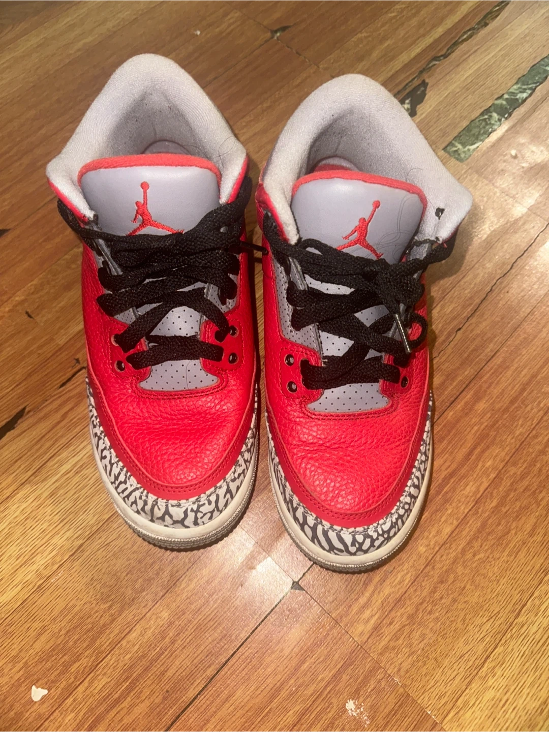 Selling a pair of Air Jordan 3 Retro in the red cement colorway. These shoes are in good condition and ready for a new home. They feature the classic elephant print detailing and a comfortable fit. Perfect for any sneakerhead or Jordan fan!