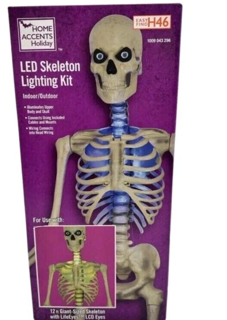 Selling a brand new Home Accents Holiday LED Skeleton Lighting Kit! It's still in the original box and ready to illuminate your Halloween skeleton. Perfect for indoor or outdoor use. It connects using included cables and mounts, and the wiring connects into head wiring. Get ready to light up your 12 ft giant-sized skeleton with LifeEyes LCD Eyes!