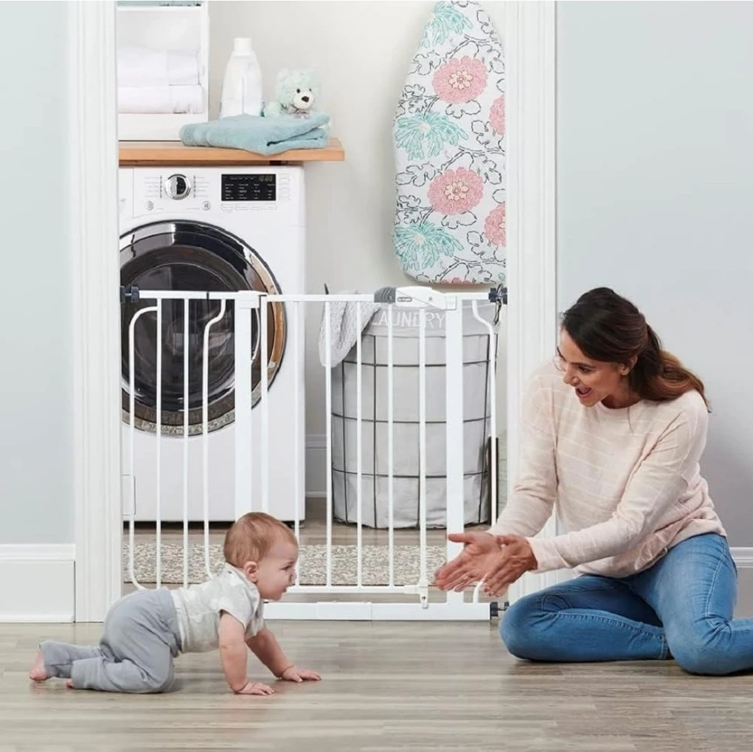 Selling a Regalo Easy Step baby gate! It's white and can fit openings from 29 to 38.5 inches wide. It's 36 inches high and pressure mounted, perfect for doorways. Recommended for ages 6 to 24 months