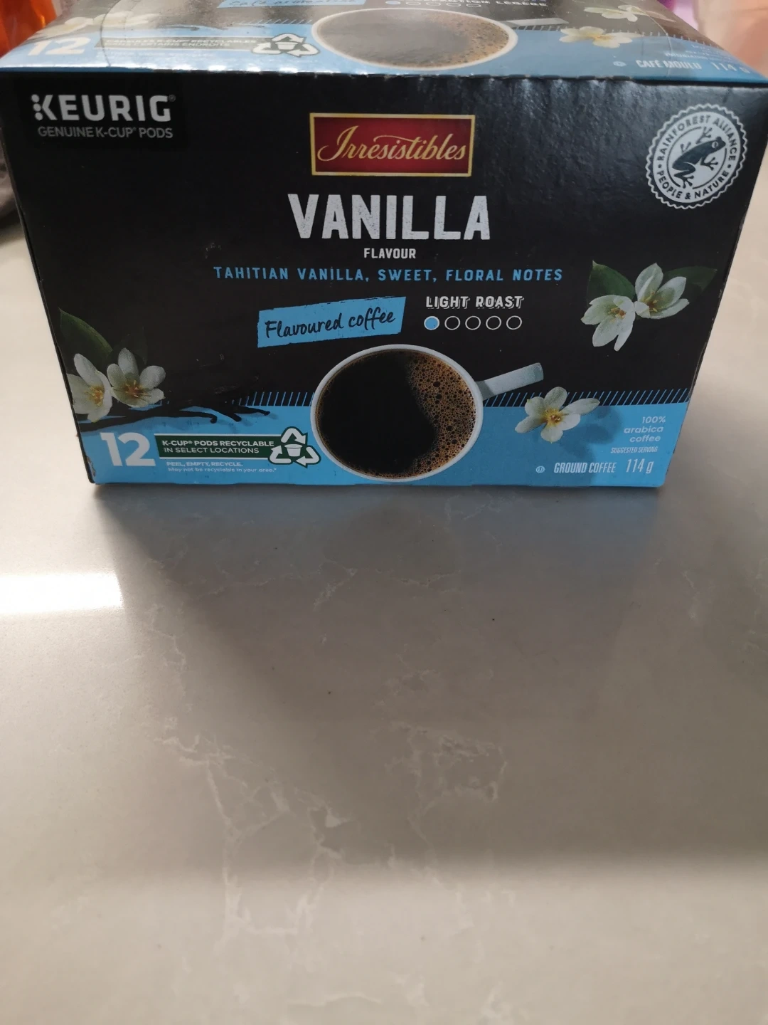 Selling a 12-pack of Irresistibles Vanilla flavour Keurig K-Cup pods. These are a light roast with Tahitian vanilla, sweet, and floral notes. Perfect for a quick and tasty coffee!