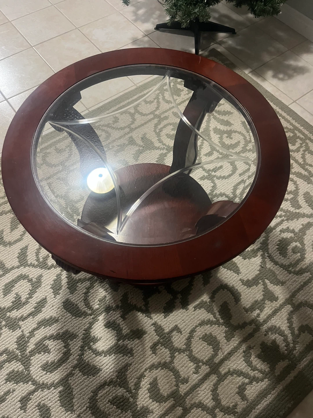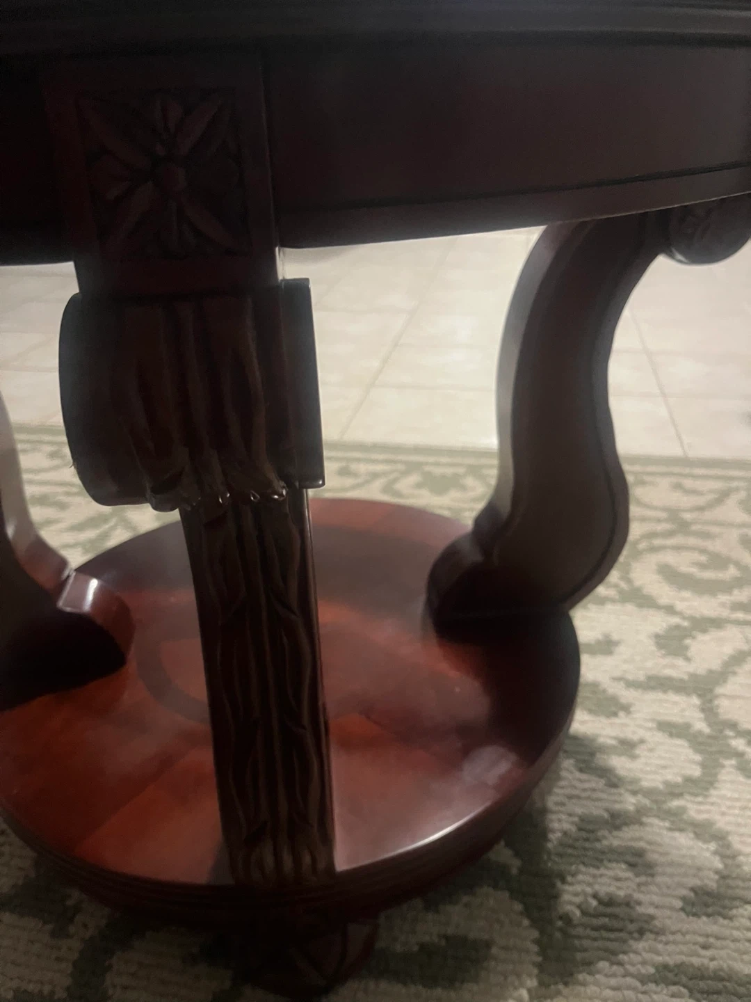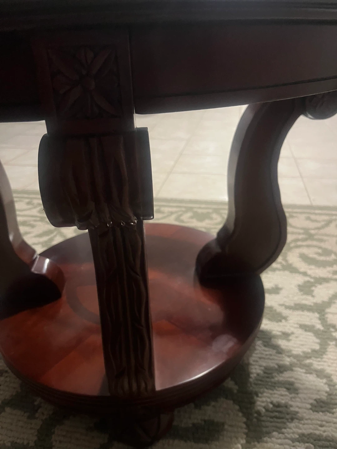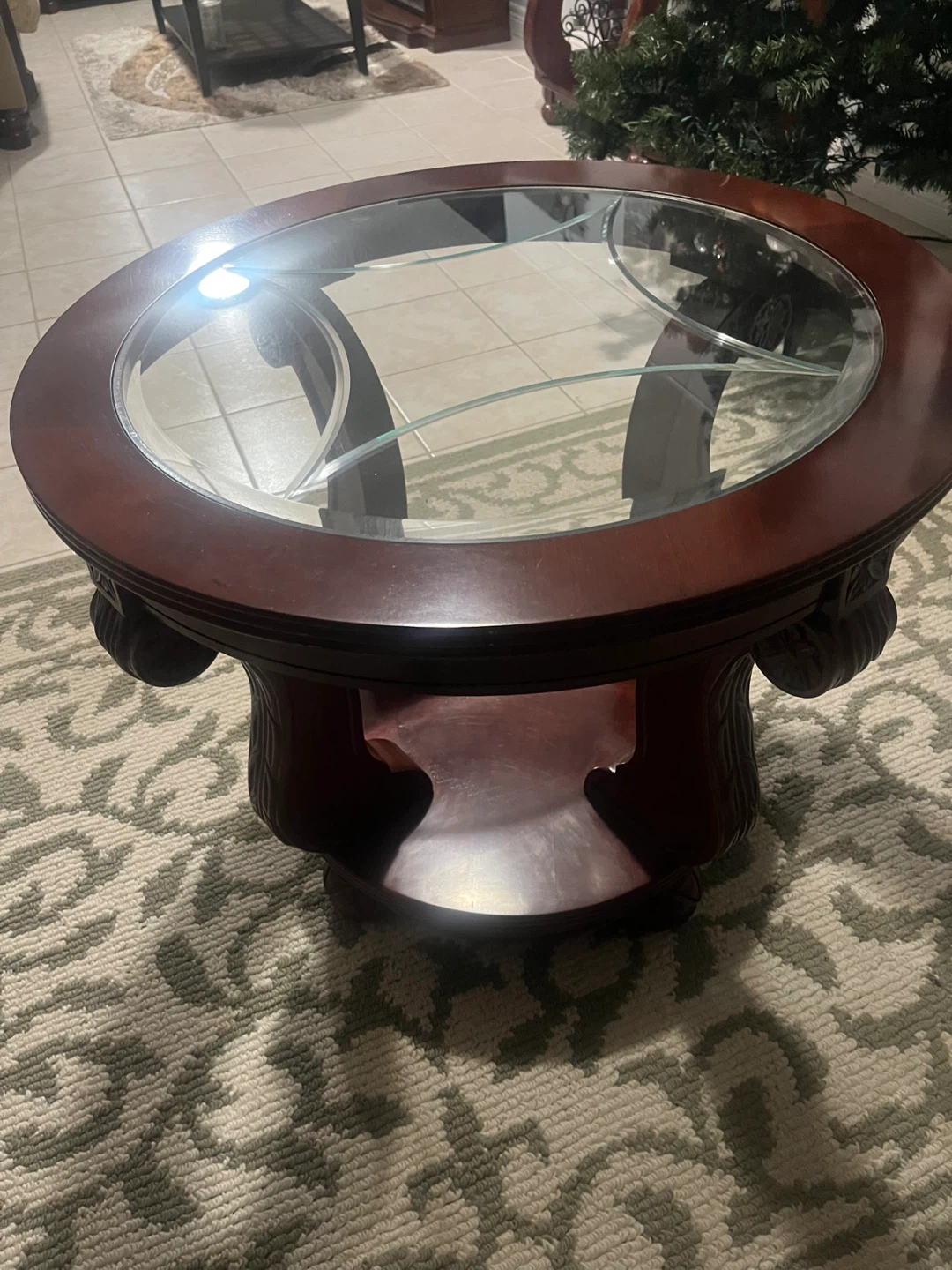 Selling a round side coffee table with a glass top. It has a dark wood finish and ornate carved legs. It's in good condition