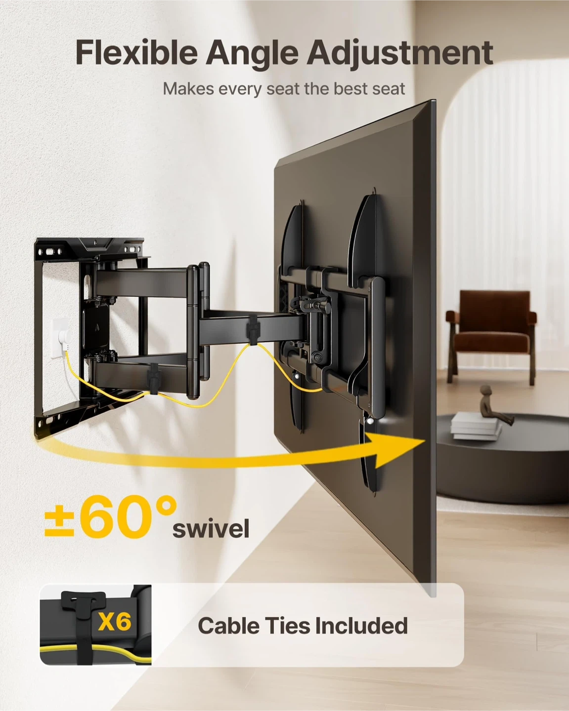 ULTRA SLIM & DISCREET DESIGN: This TV wall mount has been cleverly designed to retract to a mere 2.75 inches from the wall, ensuring a super slim profile that merges flawlessly with your living space. Its design leaves ample room for your creative home décor and with a velcro for cable management, all your cables are neatly organized and hidden, enhancing the neatness and elegance of your space