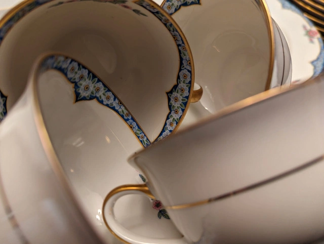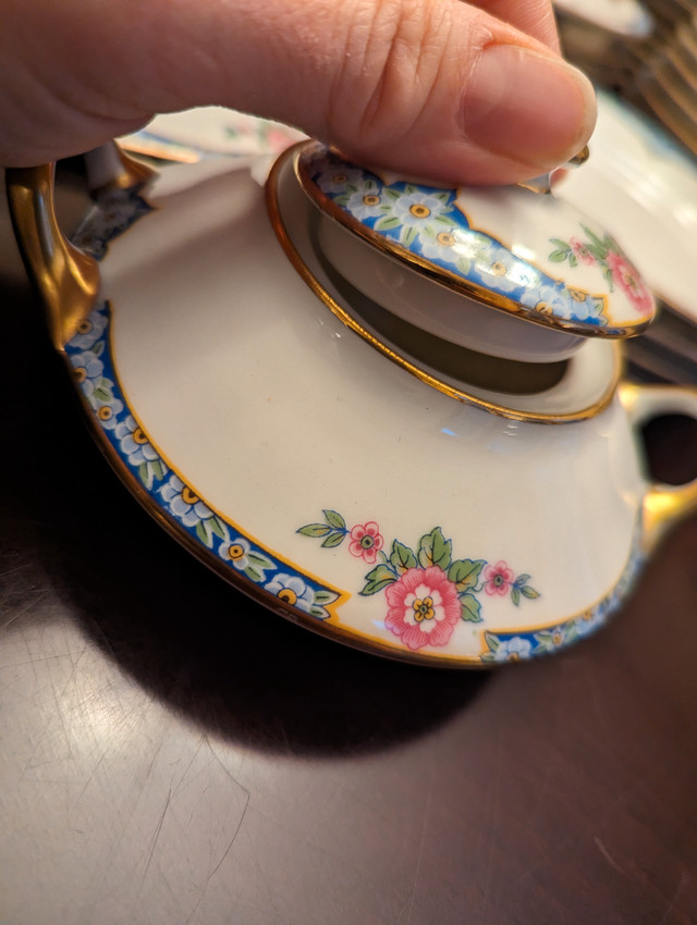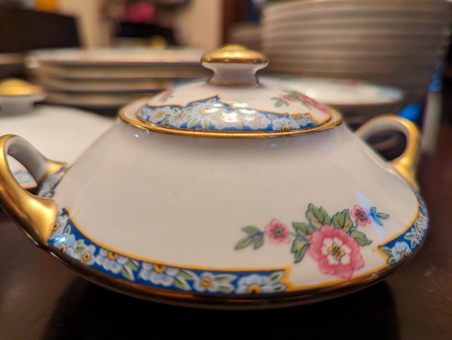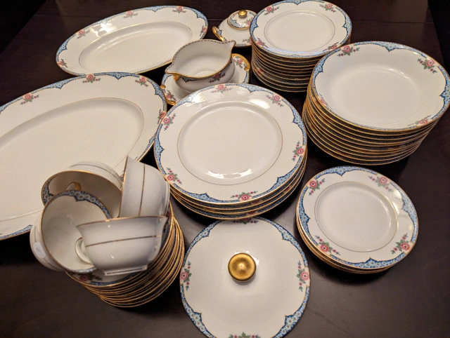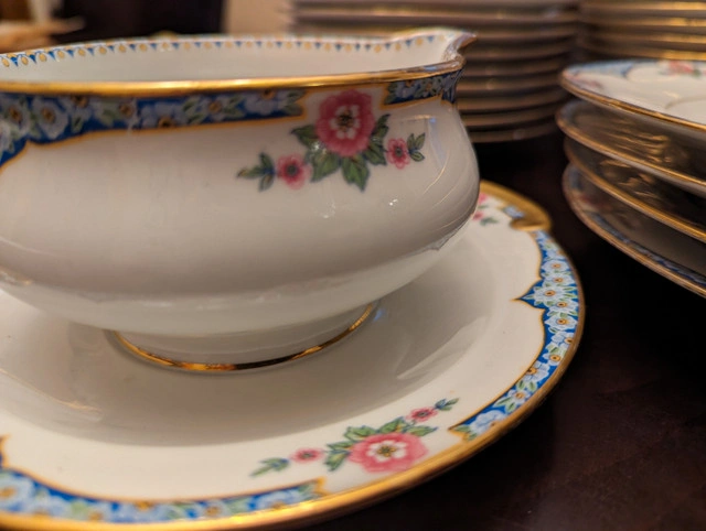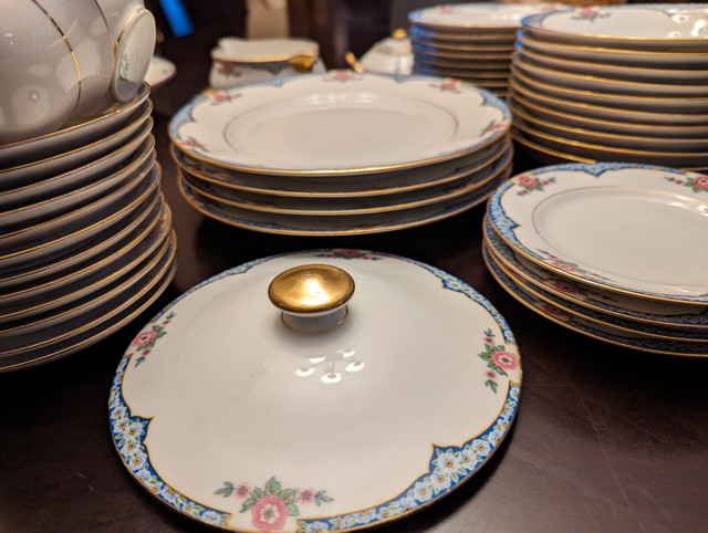 Several pieces of matched Limoges porcelain dinnerware, all in excellent condition and bearing the stamp of authenticity. Beautiful floral pattern, mostly blue with pink accent flowers and gold trim. Includes: