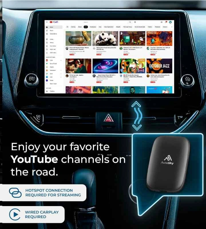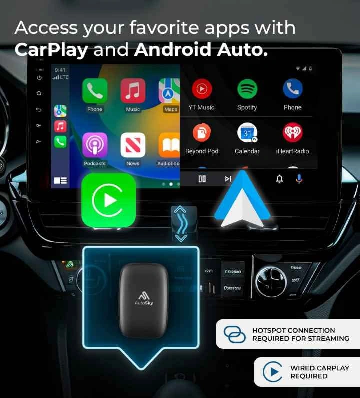 AutoSky Ai Box Lite Air - Stream on the go, Netflix and YouTube in your car. Converts your wired CarPlay to wireless CarPlay or Android Auto. Hotspot required for streaming.