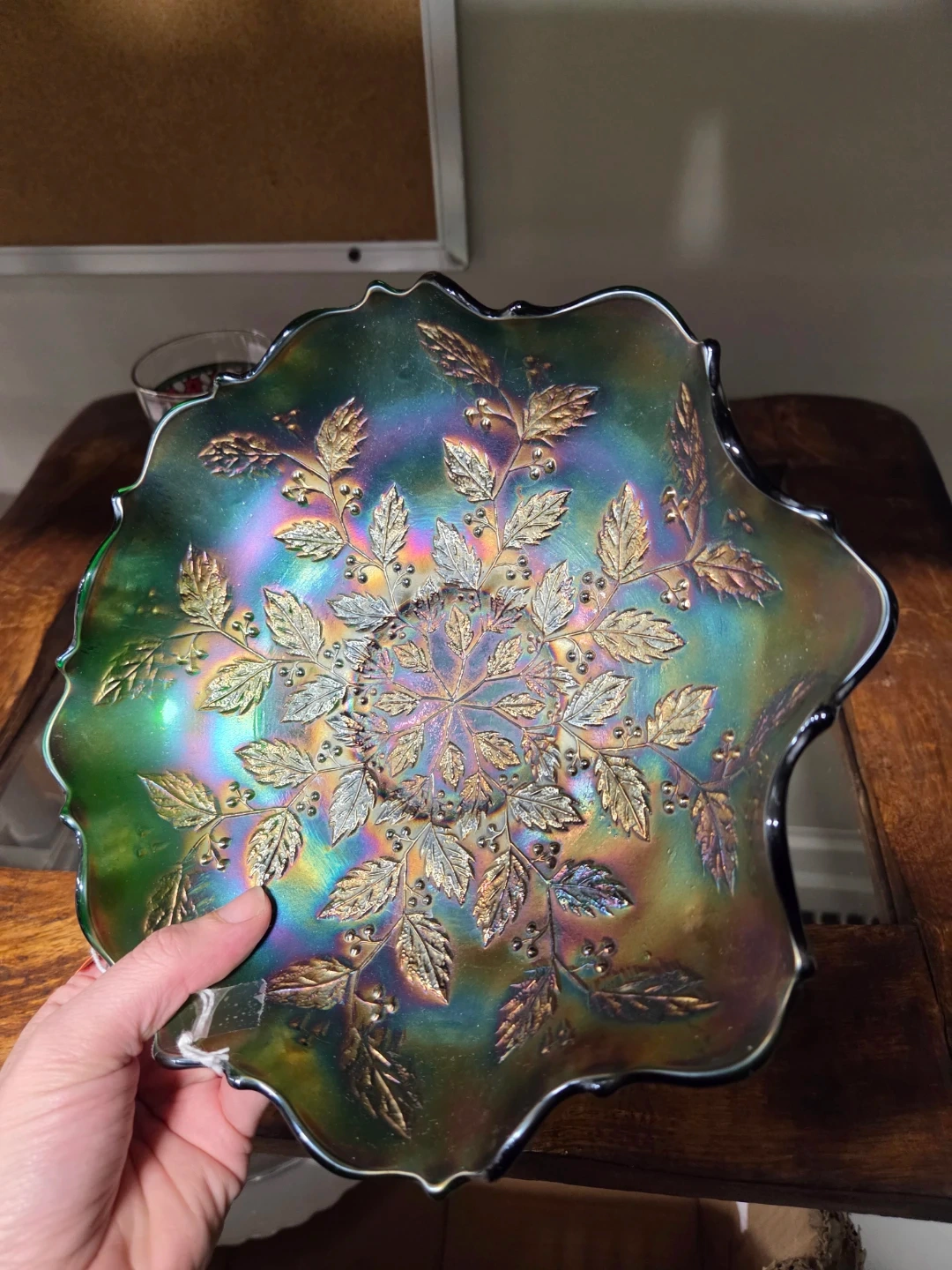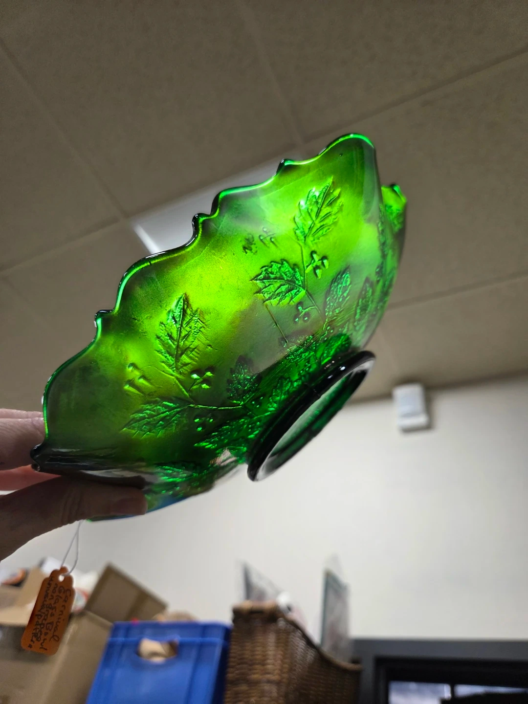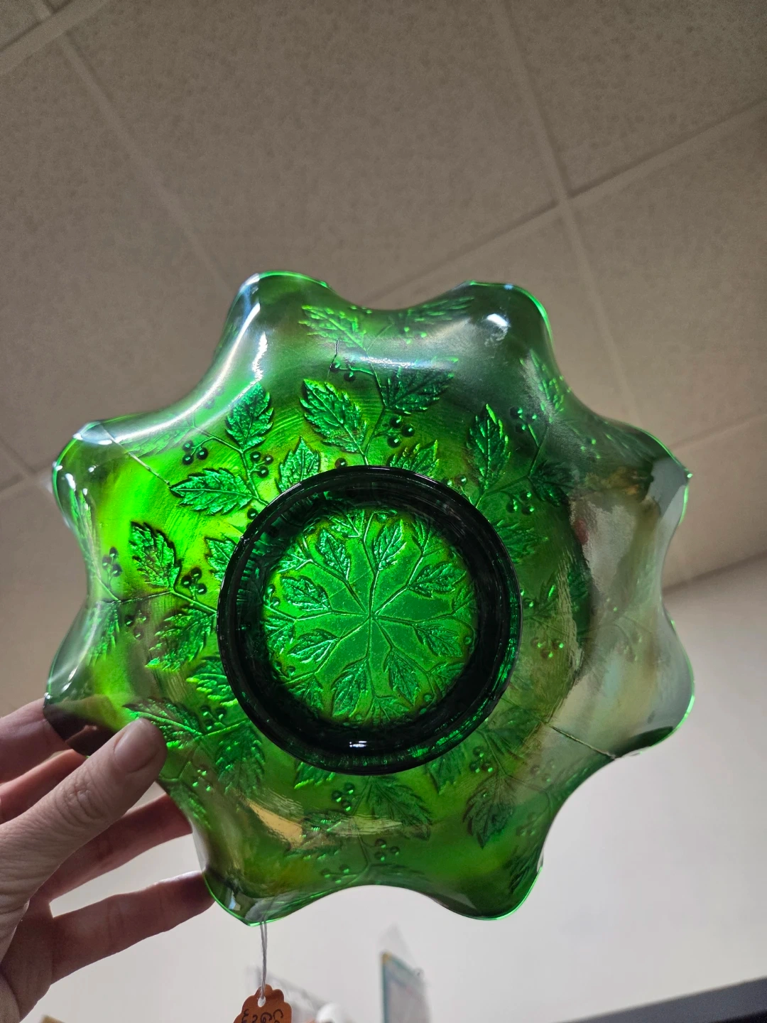 Selling a beautiful vintage Fenton carnival glass bowl in a vibrant green colour! This bowl features a lovely leaf and berry pattern. It's a great piece to add to your collection or as a decorative item for your home