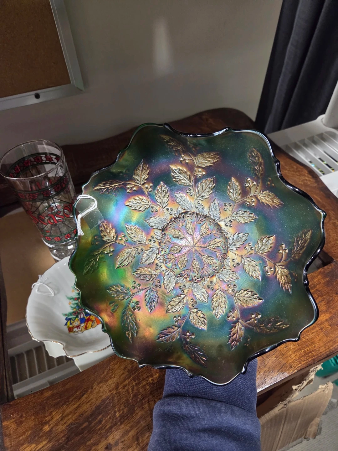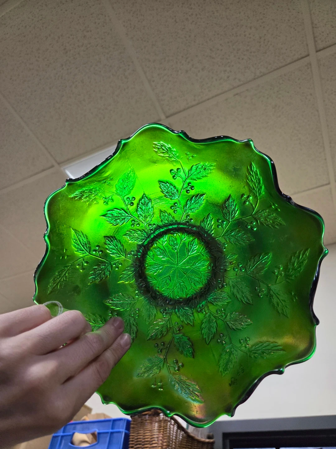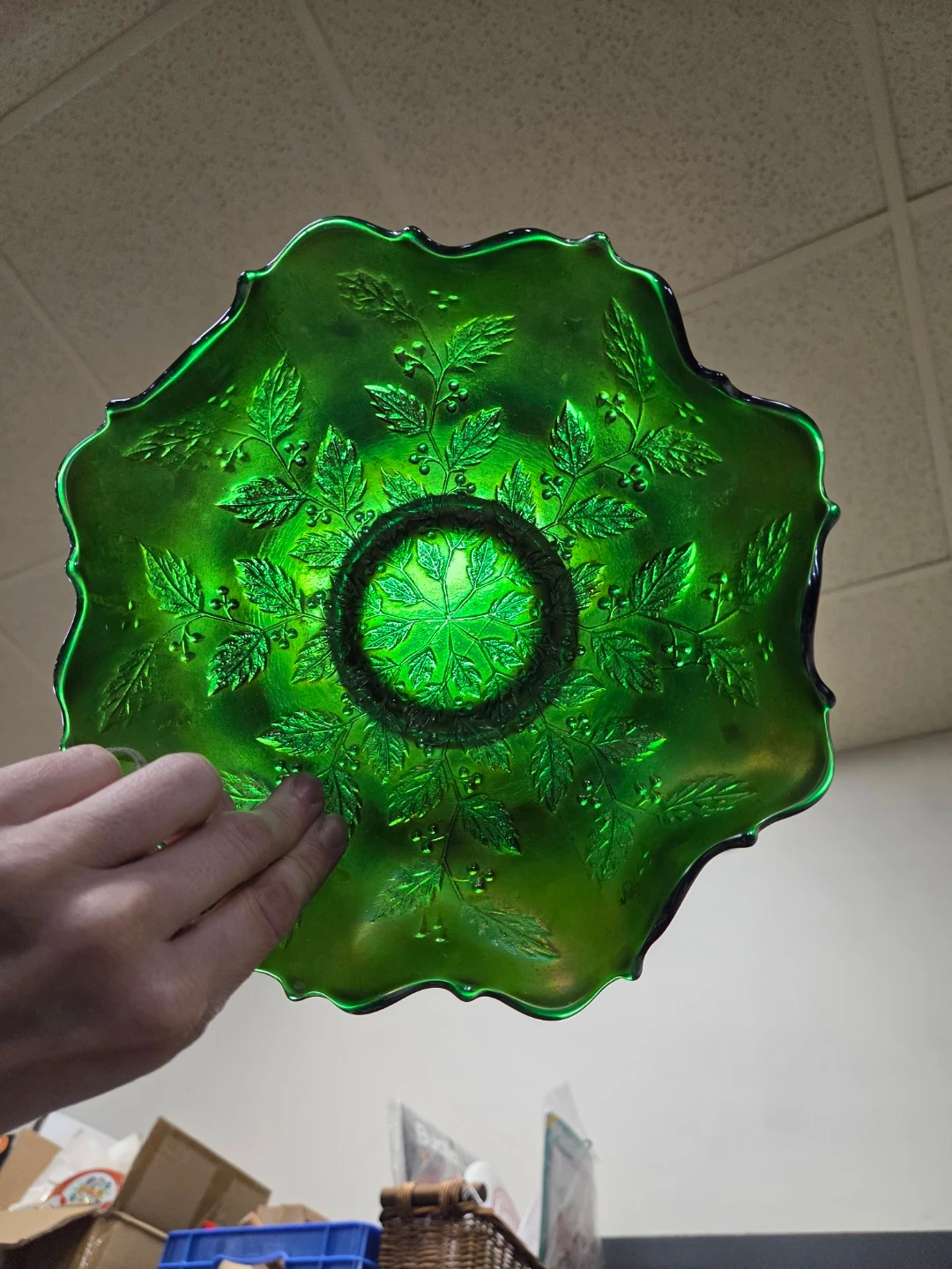 Selling a beautiful vintage Fenton carnival glass bowl in a vibrant green colour! This bowl features a lovely leaf and berry pattern. It's a great piece to add to your collection or as a decorative item for your home