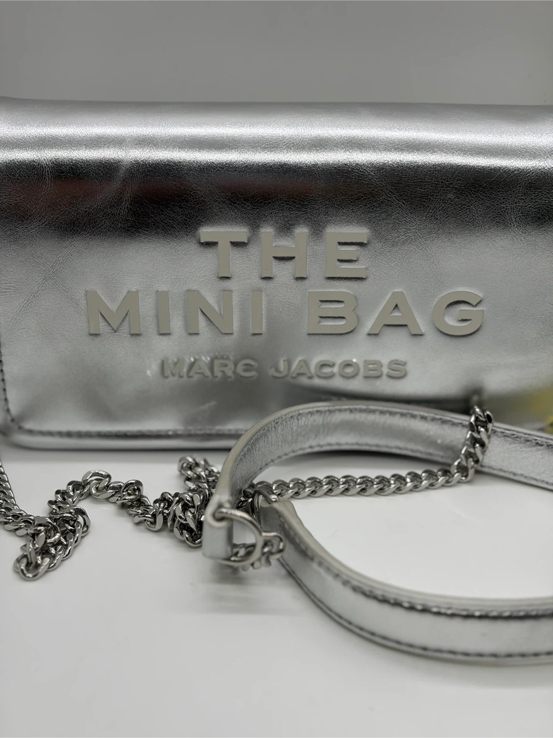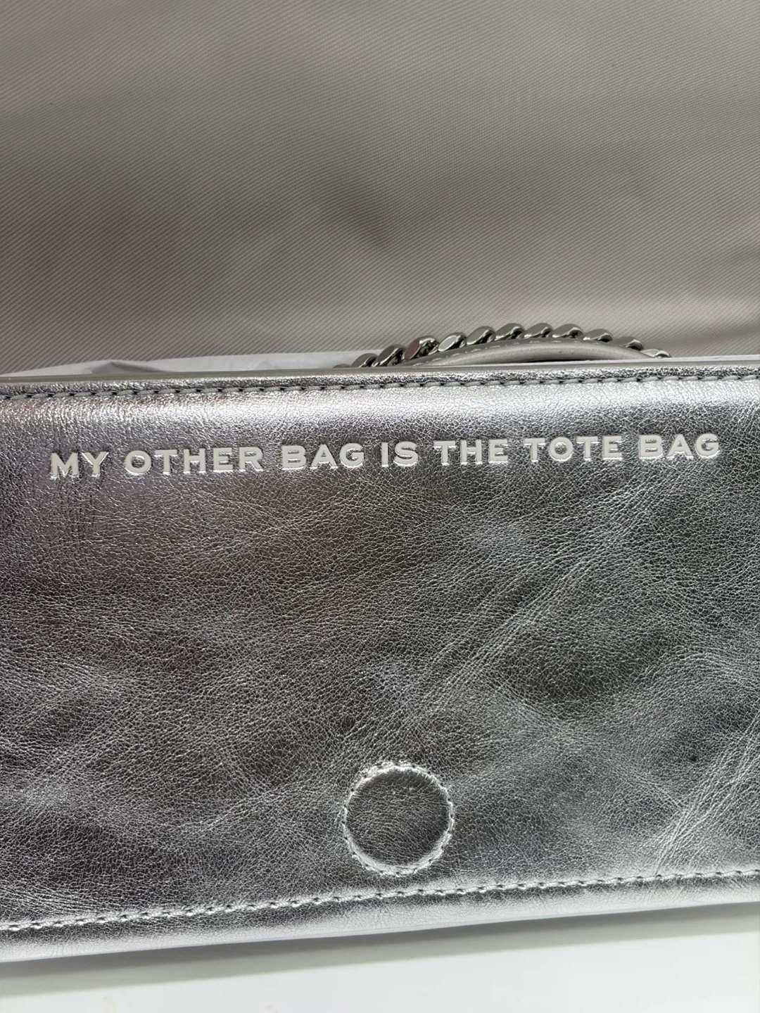 New with tag. Selling a Marc Jacobs The Mini Bag in silver! The bag features the text 'MY OTHER BAG IS THE TOTE BAG'. Dust bag included.