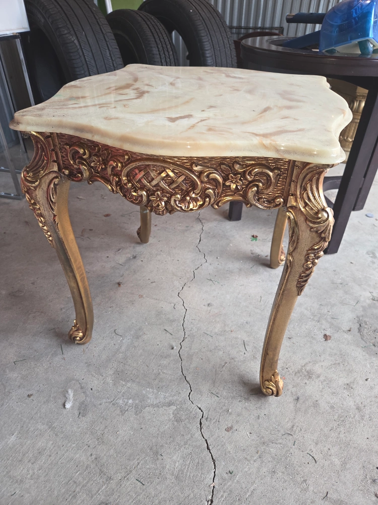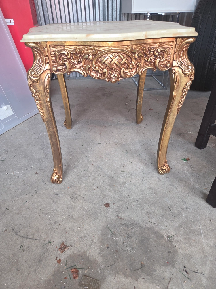 Selling a unique accent table with a marble top and ornate gold legs. It's in good condition and would add a touch of elegance to any room.
