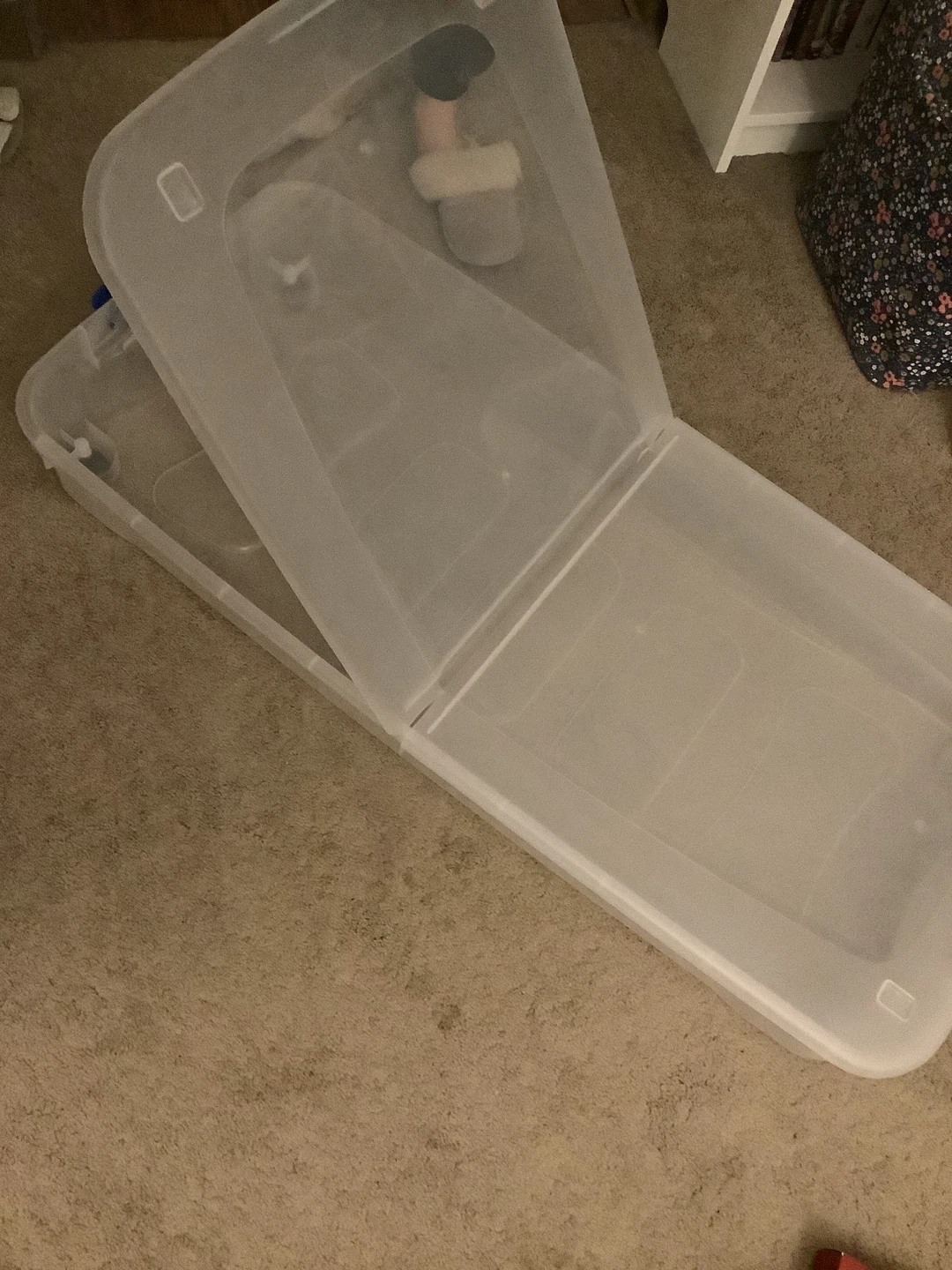 Clear plastic storage container useful for storing items under a bed. Has wheels and can be opened halfway from either end (see pics).