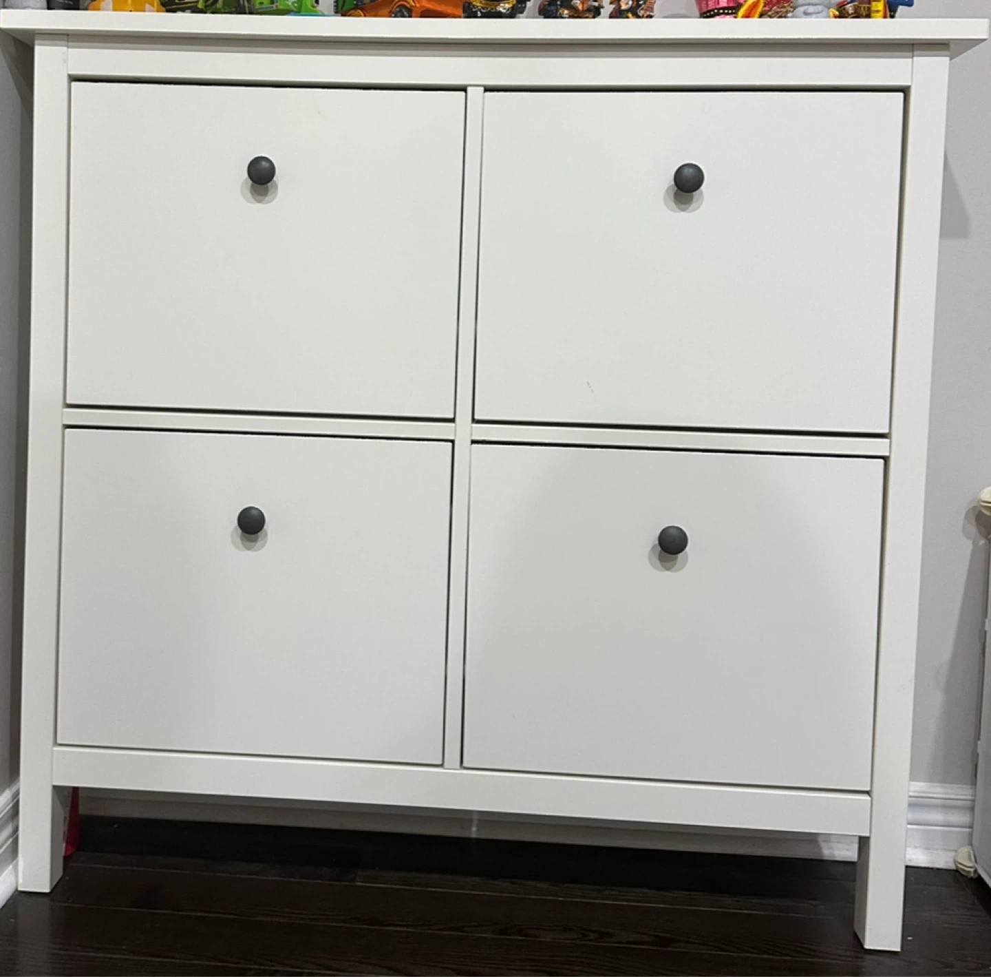 Selling a white IKEA Hemnes shoe cabinet in great condition! It features four compartments to keep your shoes organized and out of sight. Perfect for small spaces and entryways