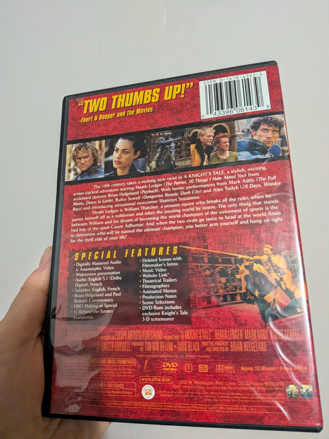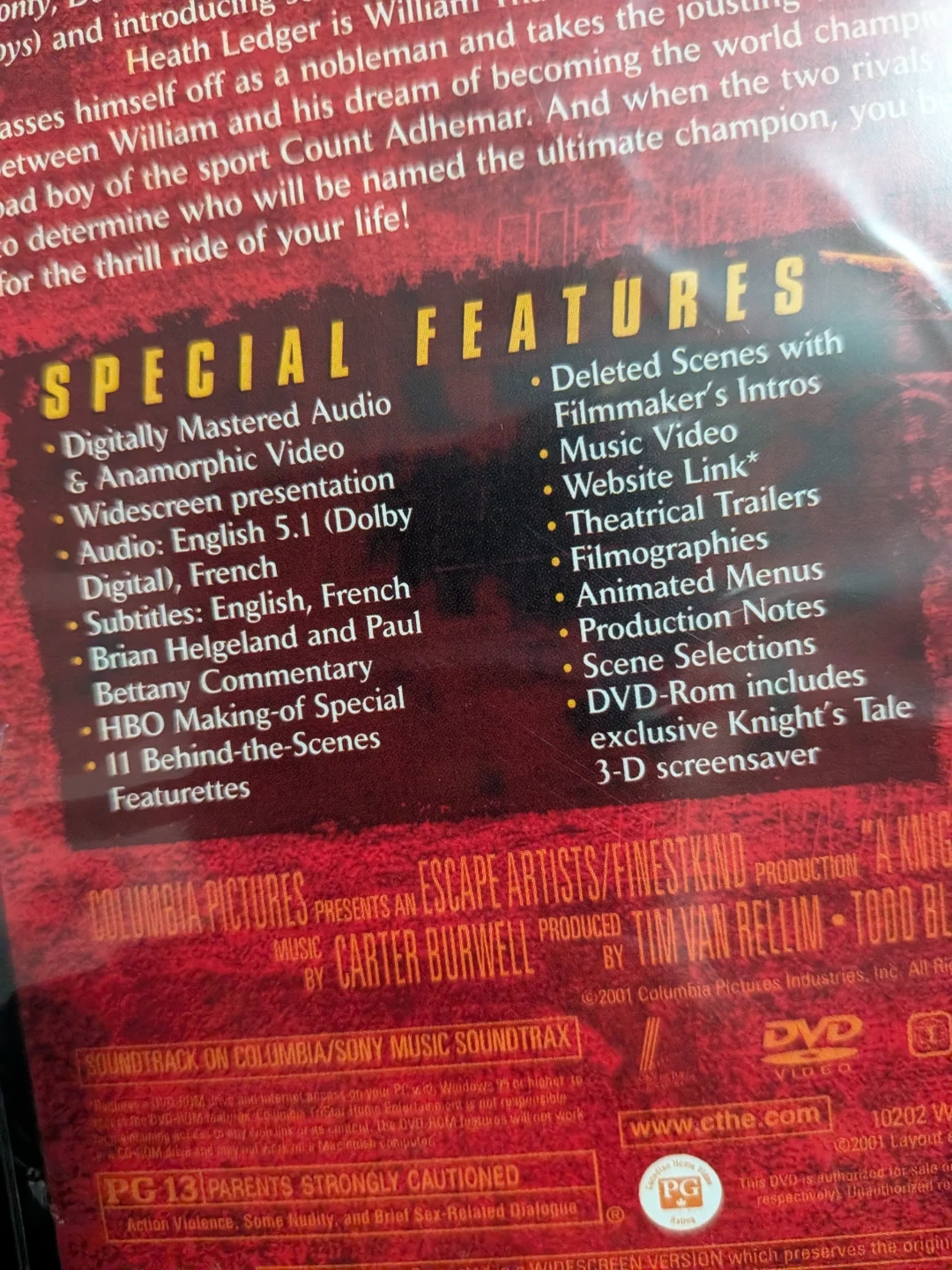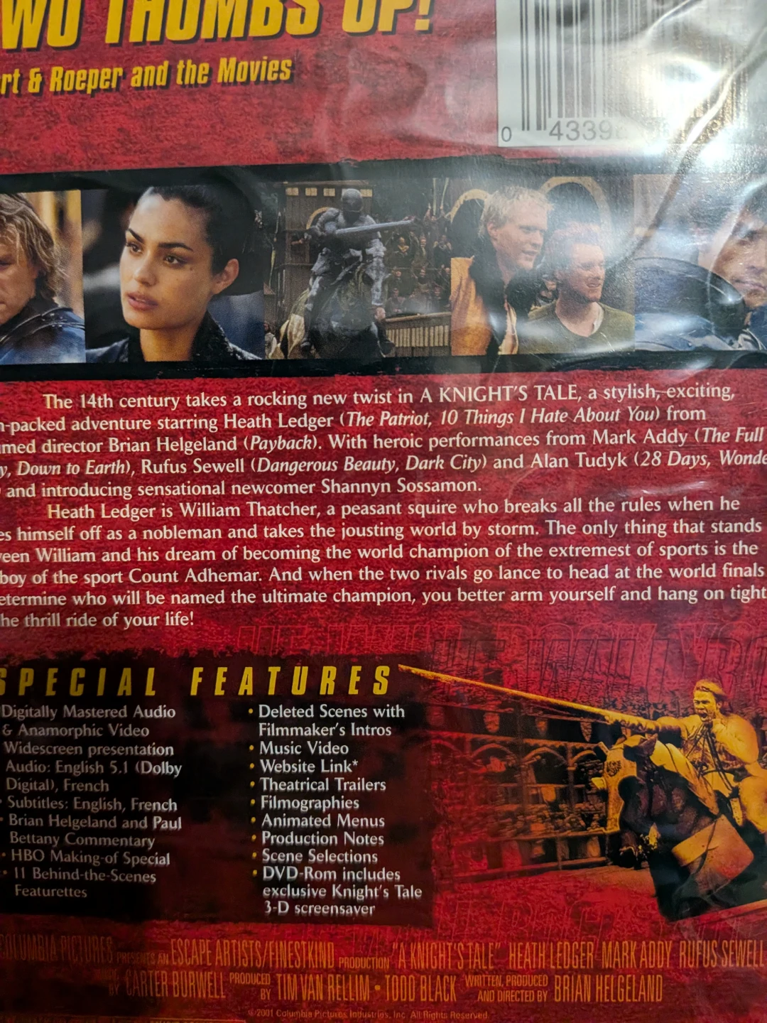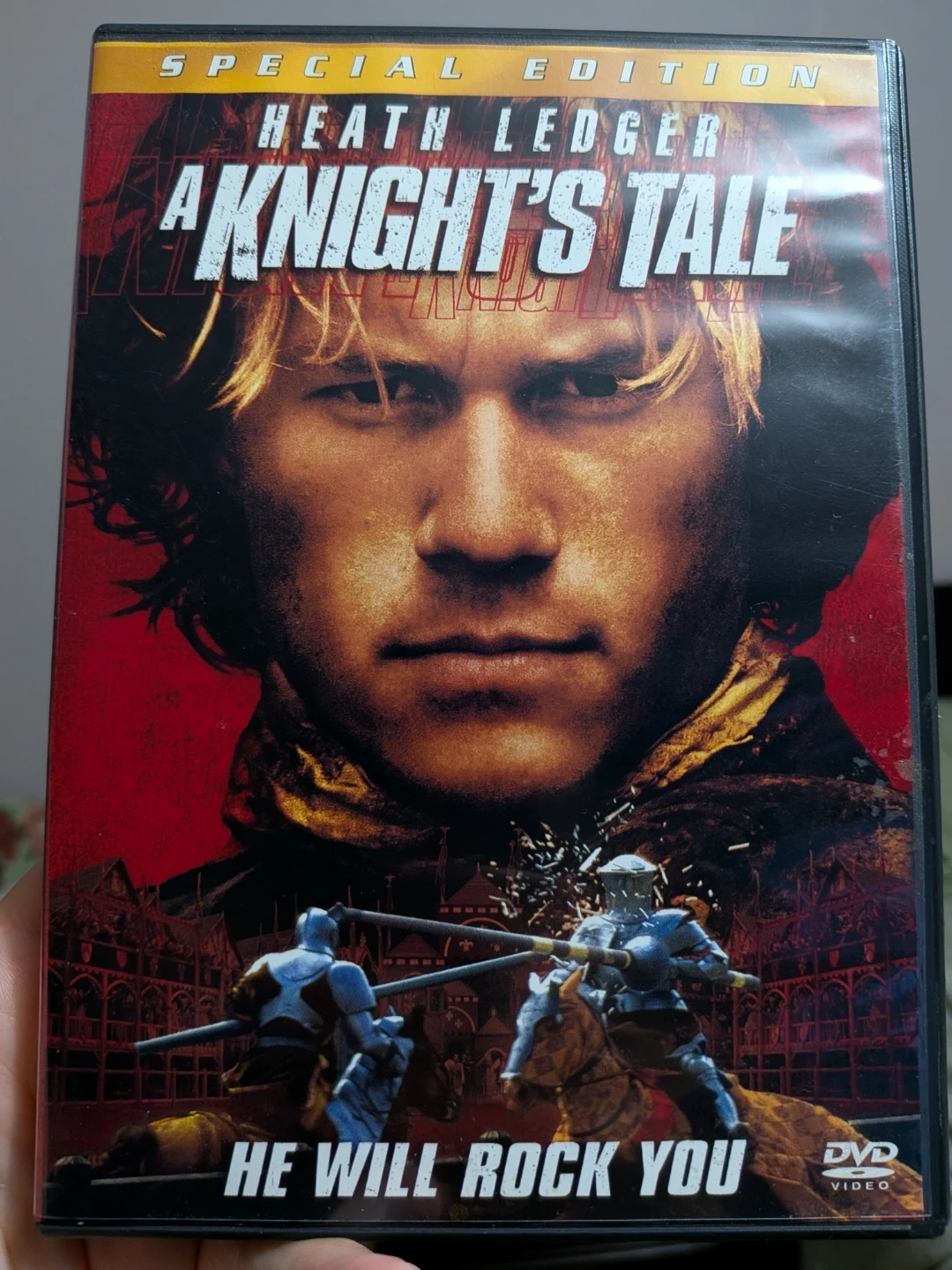Selling a Special Edition DVD of A Knight's Tale, starring Heath Ledger! This DVD includes special features like deleted scenes, filmmaker's intros, music video, website link, theatrical trailers, filmographies, animated menus, production notes, scene selections, and a DVD-Rom with exclusive Knight's Tale 3-D screensaver