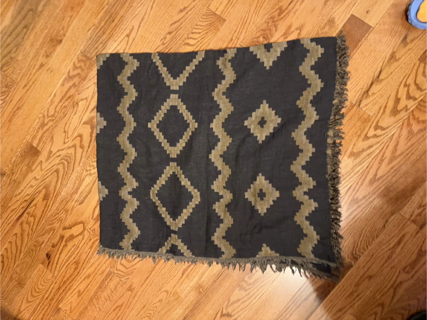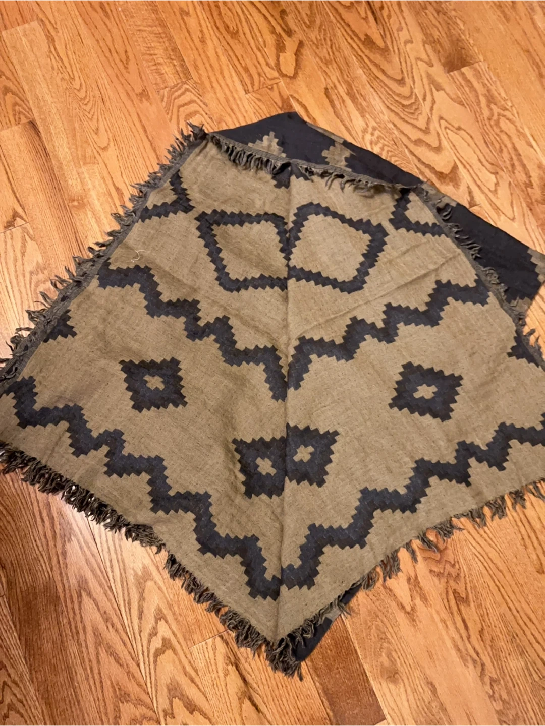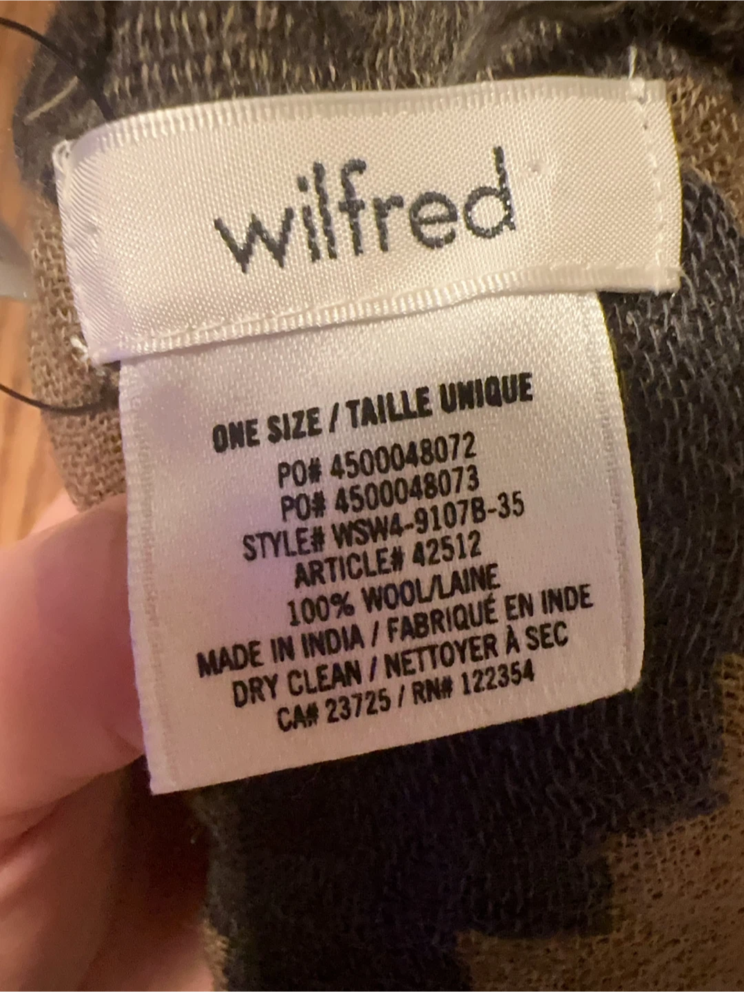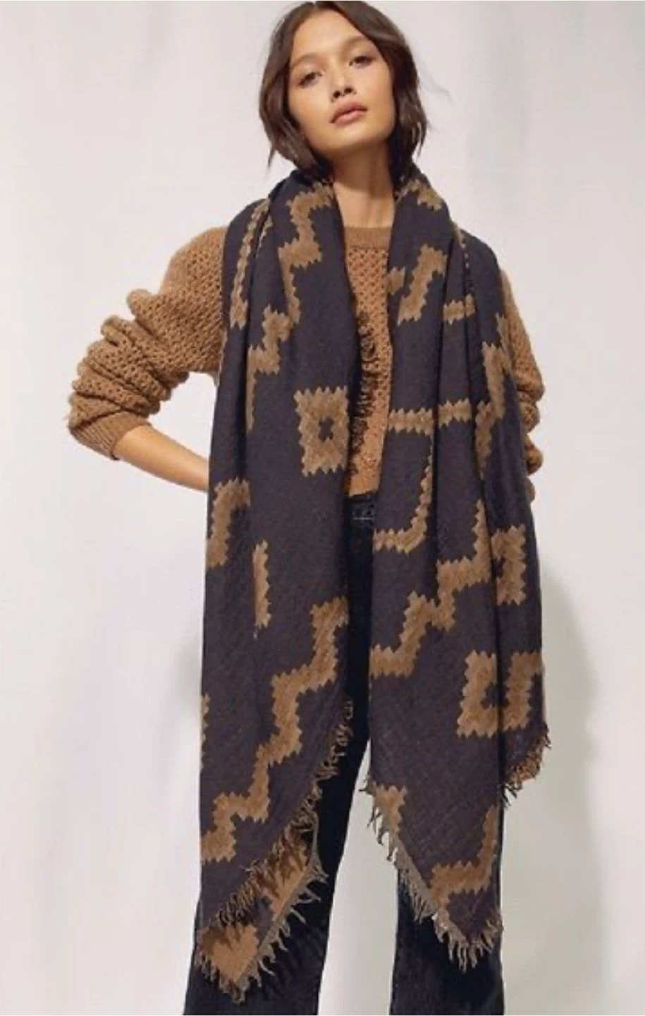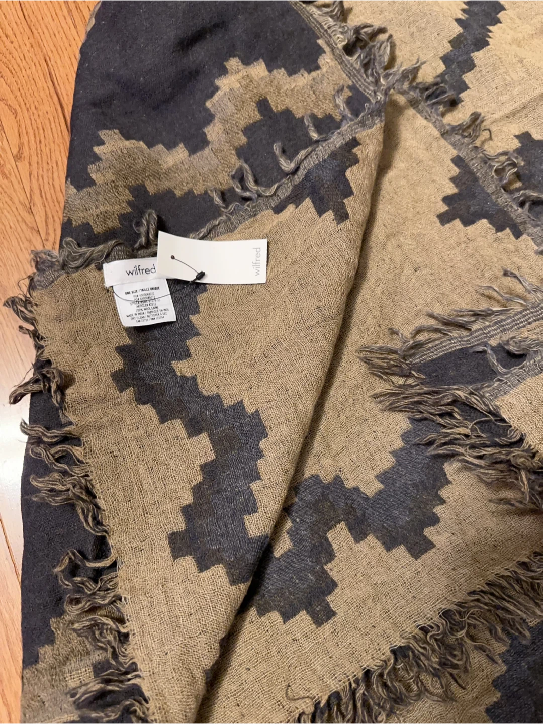 Cozy up with this Wilfred Diamond Mosaic Peniche scarf! It features a unique diamond mosaic pattern and fringed edges. The scarf is made of 100% wool and is in great condition. One size.