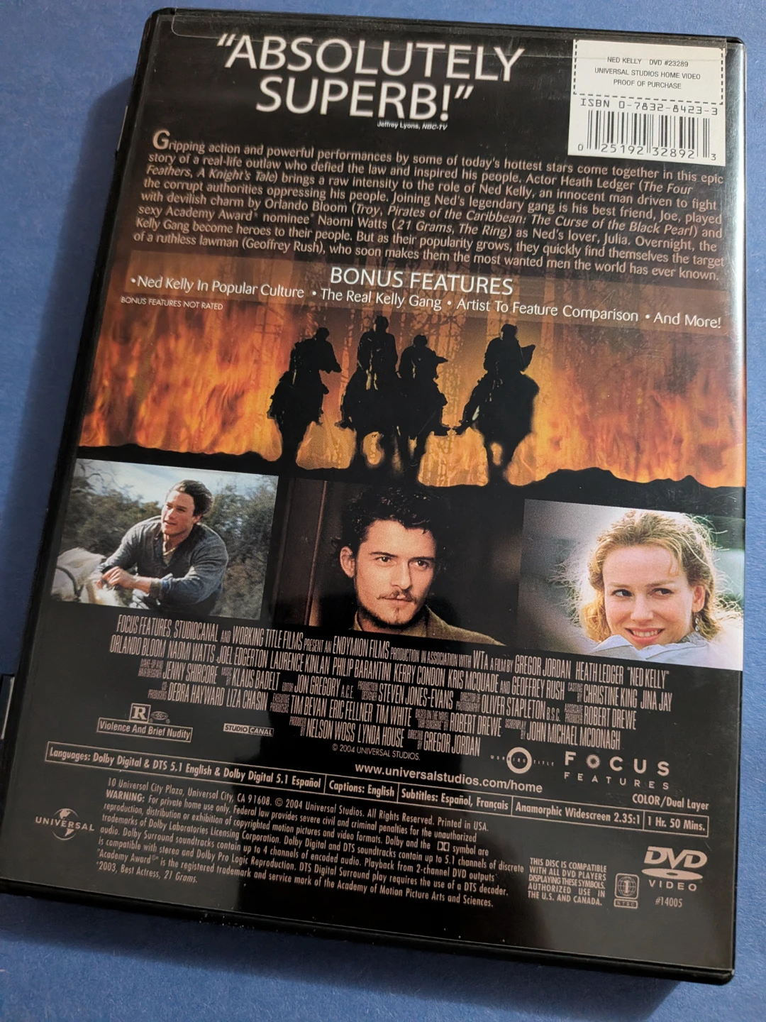 Selling a DVD of the movie Ned Kelly, starring Heath Ledger, Orlando Bloom, and Naomi Watts! The DVD includes bonus features such as "Ned Kelly In Popular Culture", "The Real Kelly Gang", and "Artist To Feature Comparison"