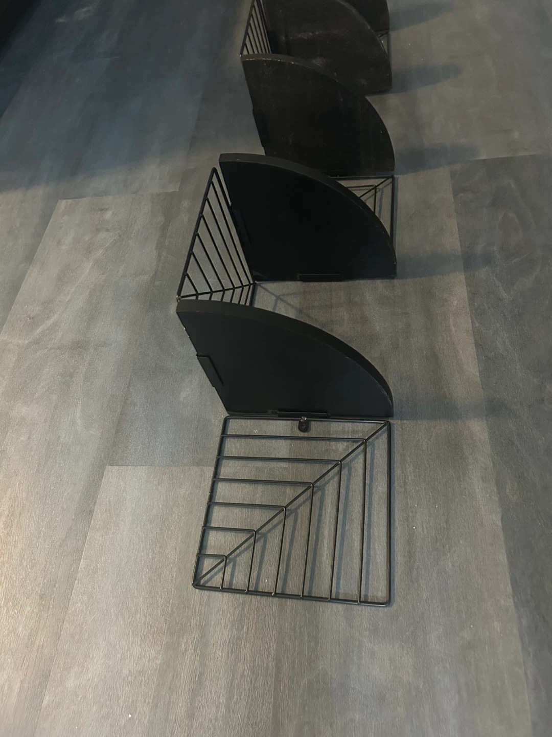 Selling a black corner shelf that's perfect for adding some extra storage to any room! It's a wall-mounted design, so it won't take up any floor space. Great for displaying plants, books, or other decorative items. It's in great condition and ready for a new home!