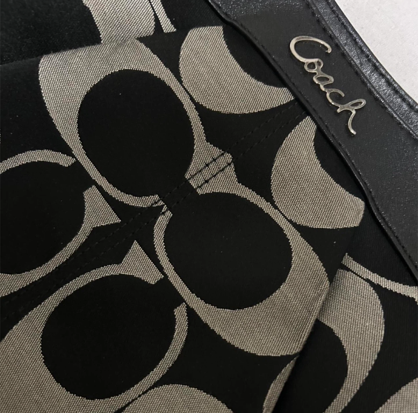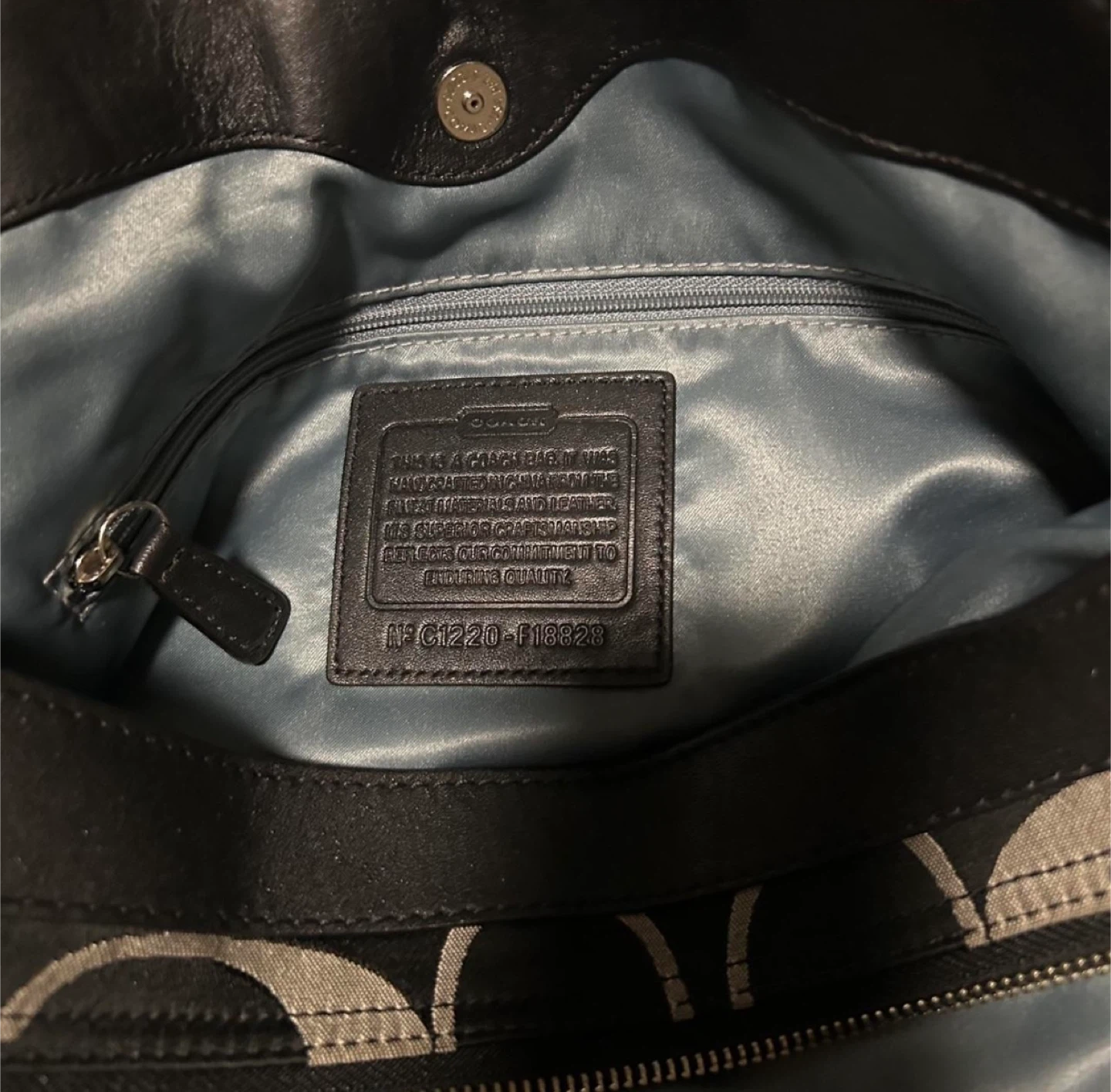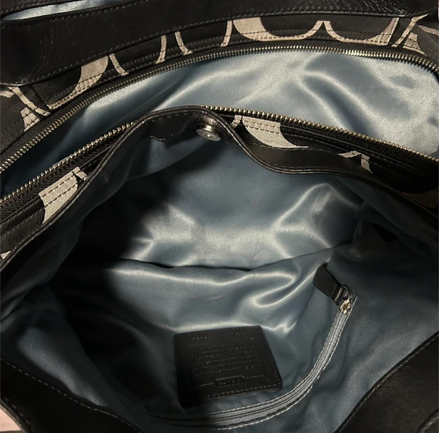 Authentic Vintage Coach Signature Canvas Lexi black & grey shoulder bag. Blue satin interior. Overall very clean. Vintage and in great condition. There are some stains inside but otherwise no other wear. Can fit a 13 inch laptop.