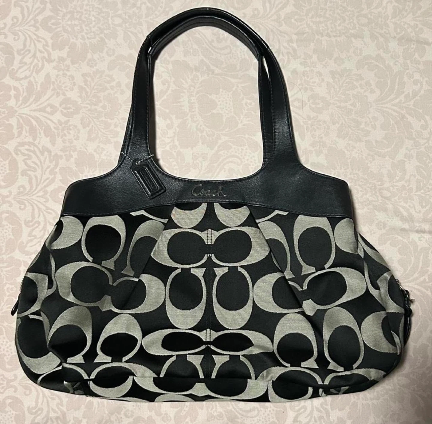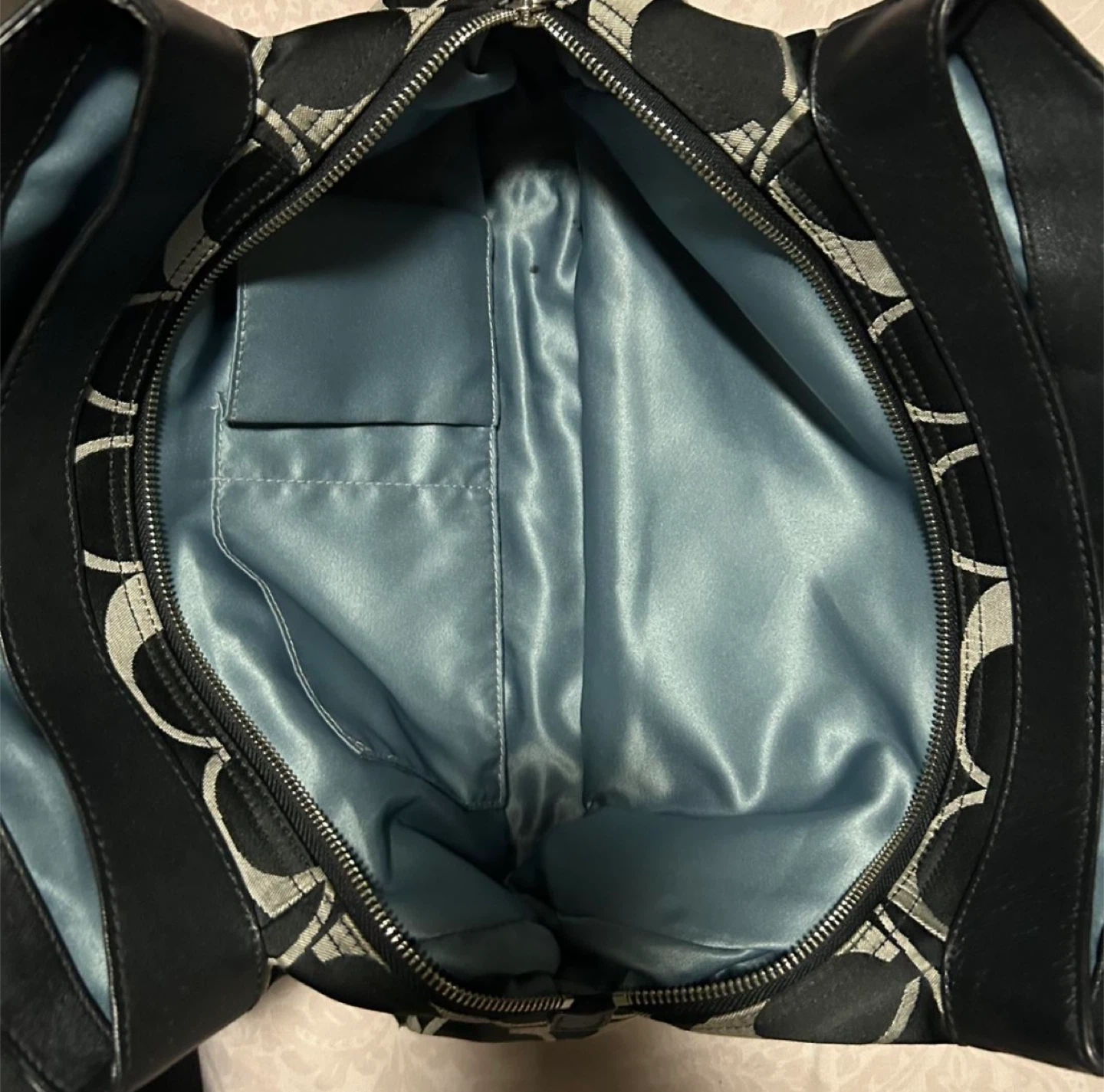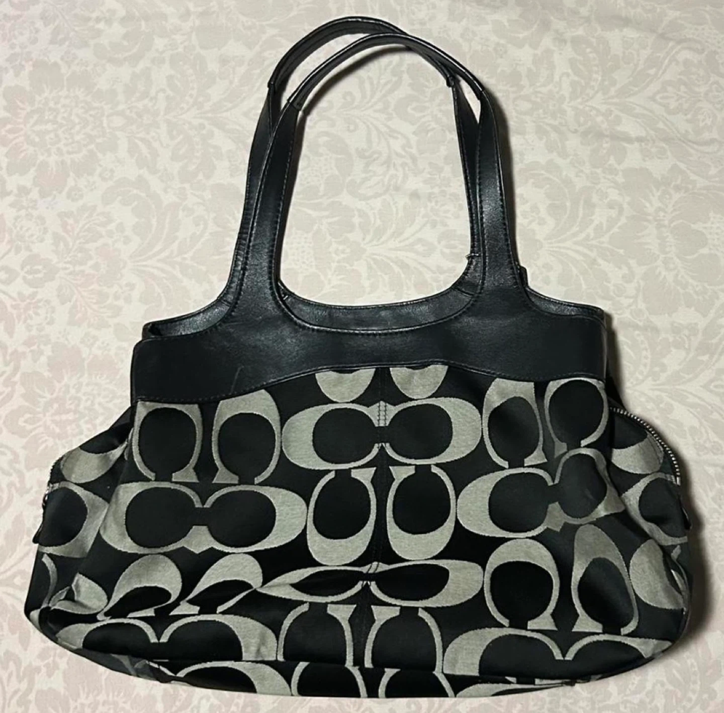 Authentic Vintage Coach Signature Canvas Lexi black & grey shoulder bag. Blue satin interior. Overall very clean. Vintage and in great condition. There are some stains inside but otherwise no other wear. Can fit a 13 inch laptop.