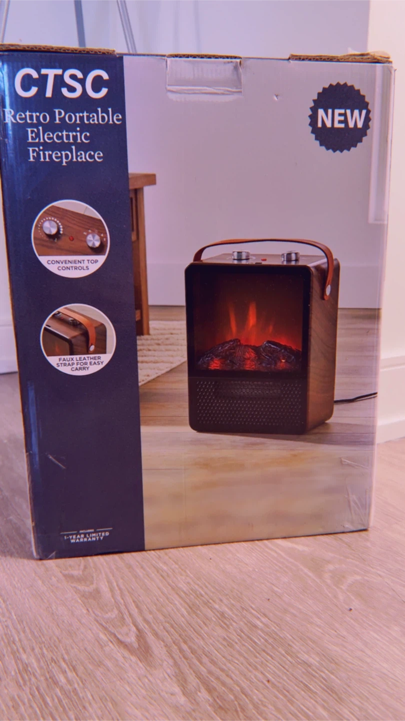 Selling a brand new CTSC Retro Portable Electric Fireplace! It comes in the original box and features convenient top controls and a faux leather strap for easy carrying. It uses ceramic heating and provides quick, powerful, even heat for active family homes