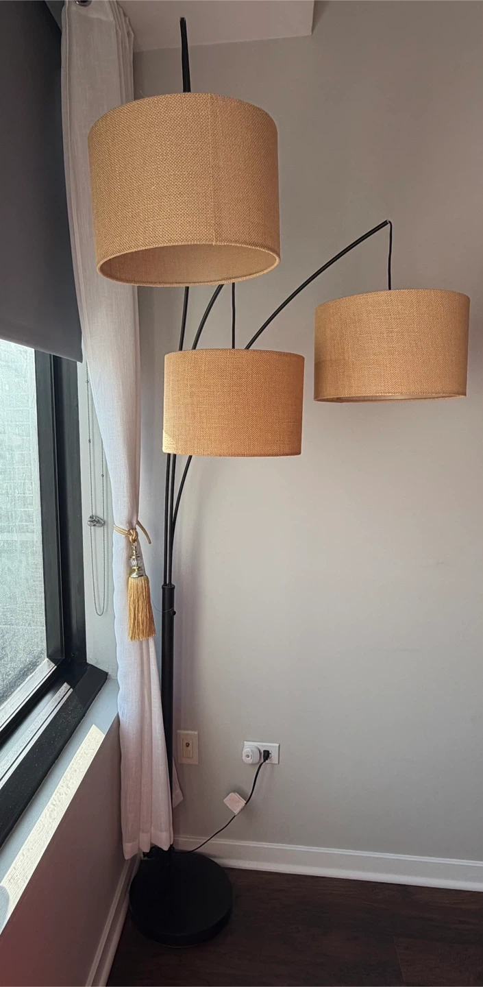Selling a stylish arc floor lamp featuring three lights. It adds a warm and inviting glow to any room! Smart bulb enabled.