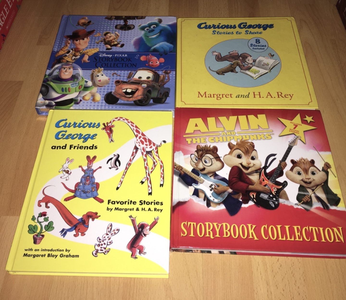 We are selling a collection of kids' storybooks featuring Curious George and Alvin and the Chipmunks and Disney.