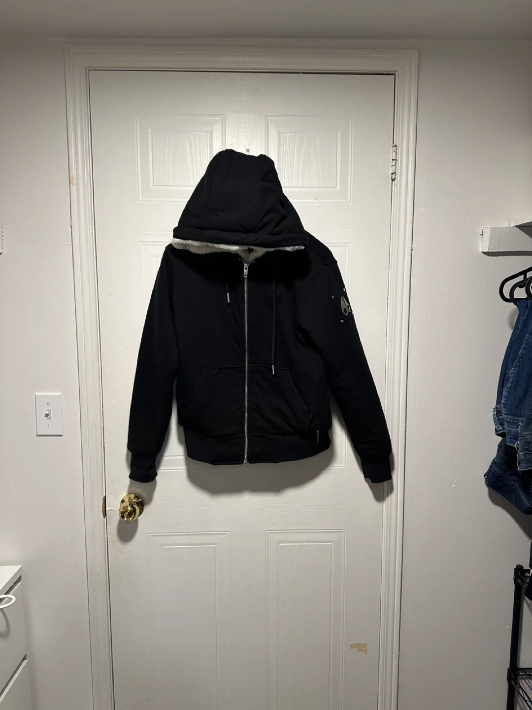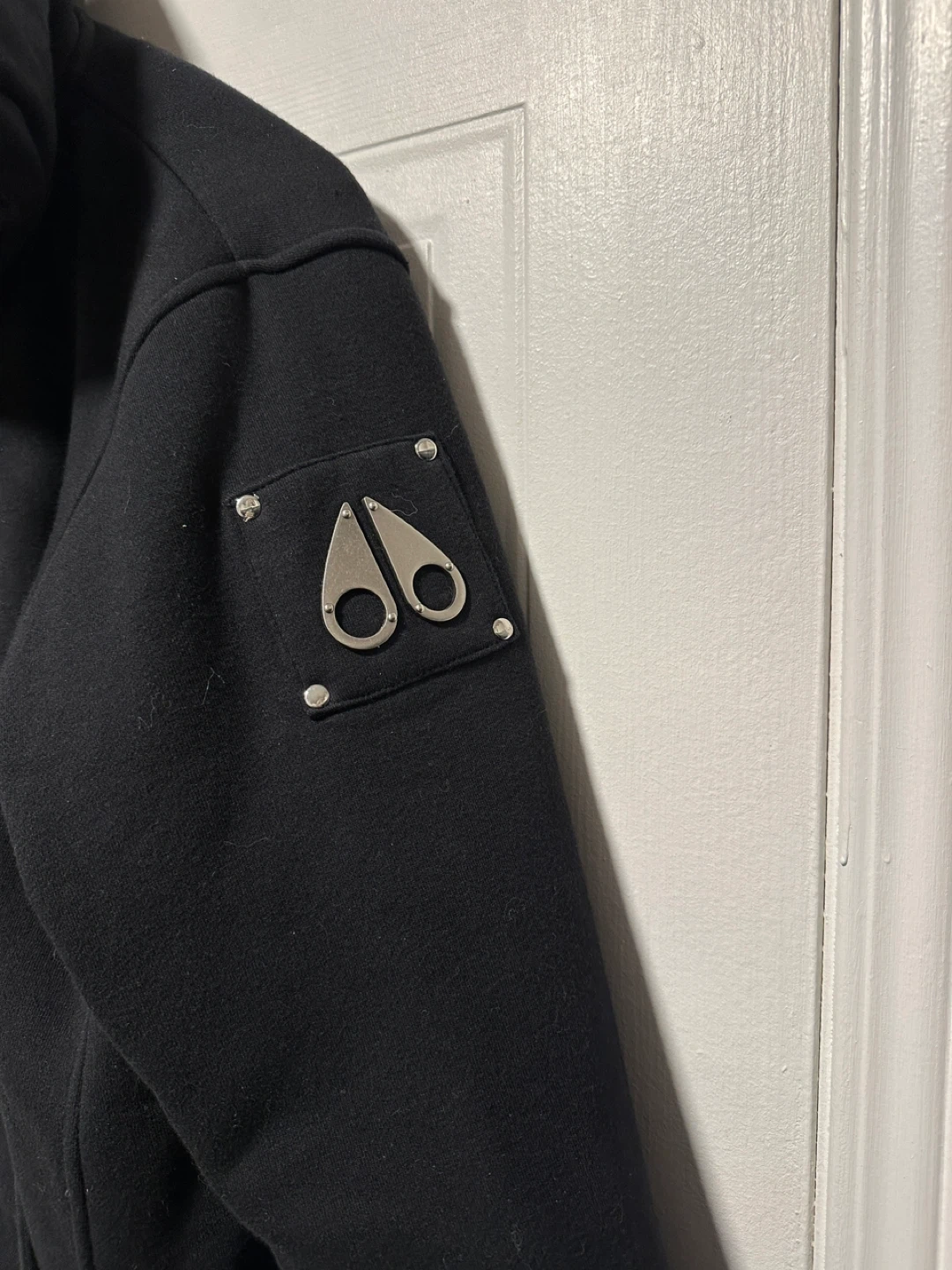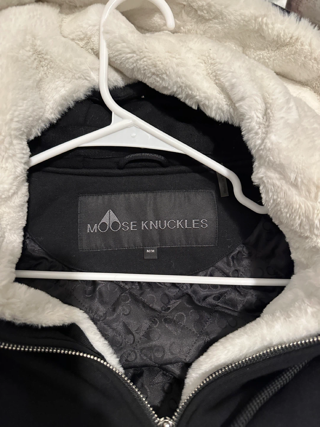 Selling a Moose Knuckles . It's in great condition and ready for a new home! The jacket features a cozy, fur-lined hood and the signature Moose Knuckles logo on the sleeve.
